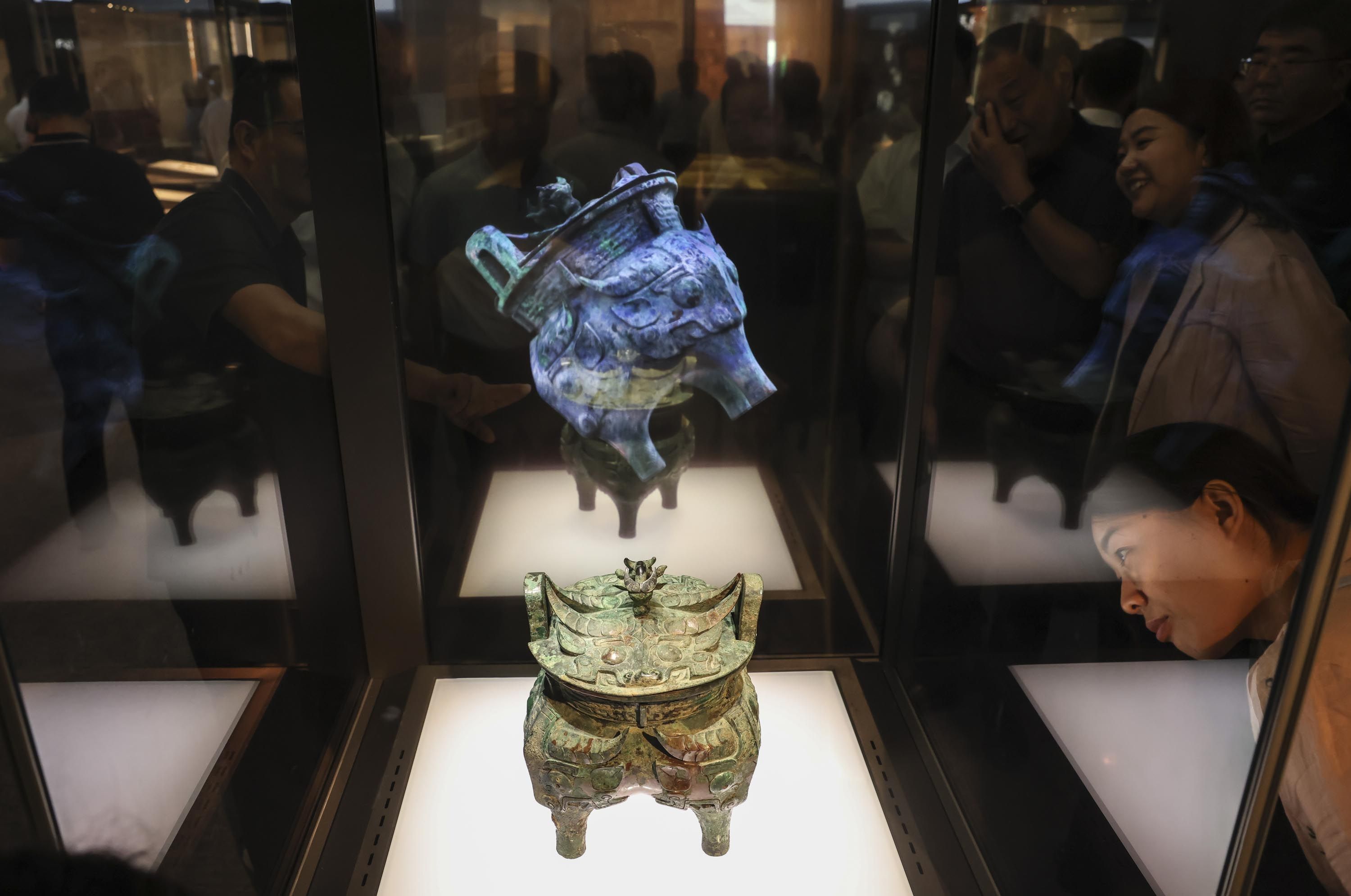 观众在观看首都博物馆镇馆之宝伯矩鬲。资料图片/新京报记者 浦峰 摄