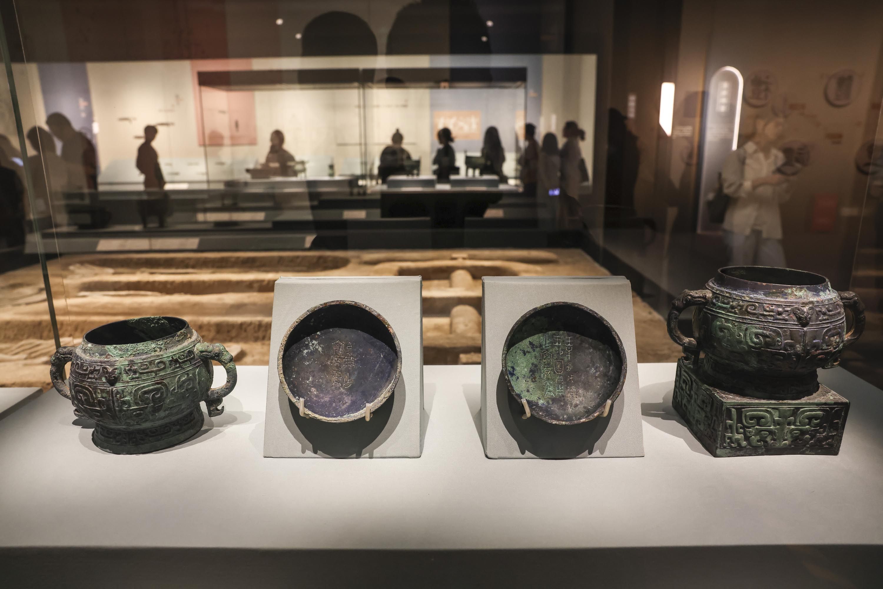 被考古界津津乐道的“一错三千年”的两件器物——伯鱼簋和圉簋(yǔ guǐ)也在此次展览中聚首,两件器物的器盖内铭文首次得到展示。2021年,琉璃河遗址M1901号墓新出土的伯鱼簋与40多年前出土的圉簋纹饰相同,器盖内铭文为“白(伯)鱼作宝尊彝”,器内底铭文为“王赐圉贝,用作宝尊彝”。据铭文推断,这两件簋的盖、身在下葬时应是混淆了,一错3000年。时隔40余年,两器重聚首,证明了(伯)鱼和圉实为同一人,为西周的名、字制度研究增加了确凿证据。