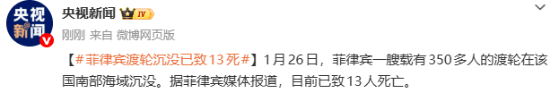 据央视新闻微博消息,1月26日,菲律宾一艘载有350多人的渡轮在该国南部海域沉没。据菲律宾媒体报道,目前已致13人死亡。