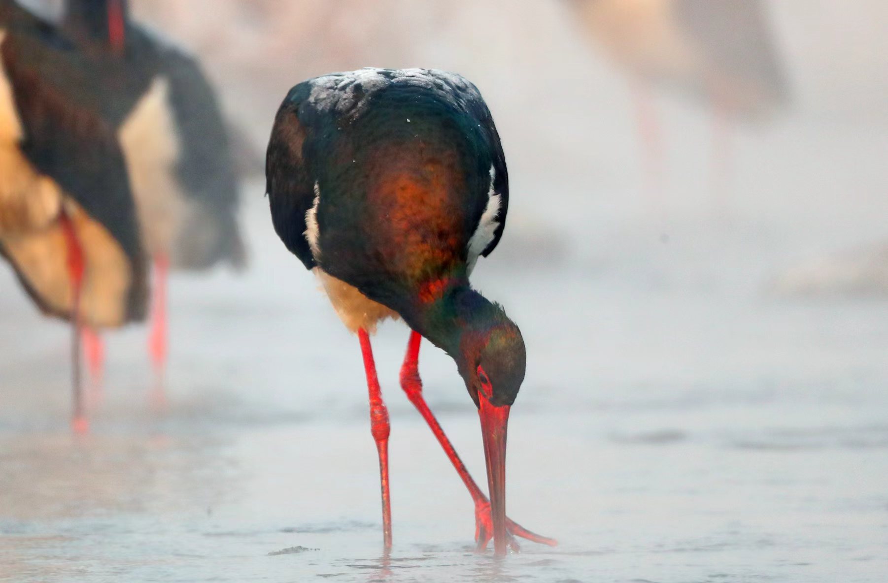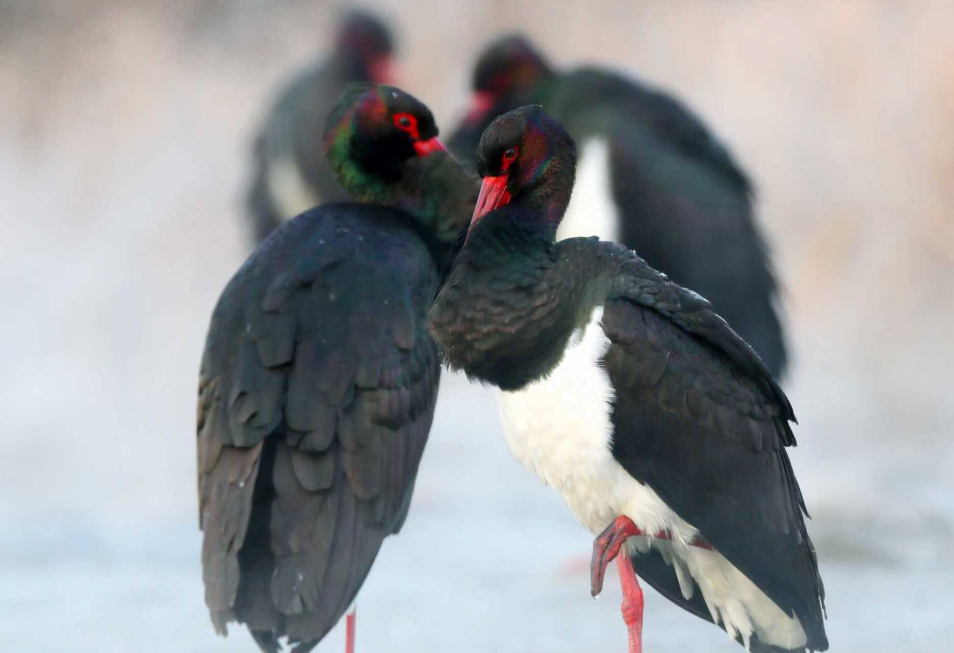 黑鹳鲜红的长嘴、长腿、眼斑格外醒目。