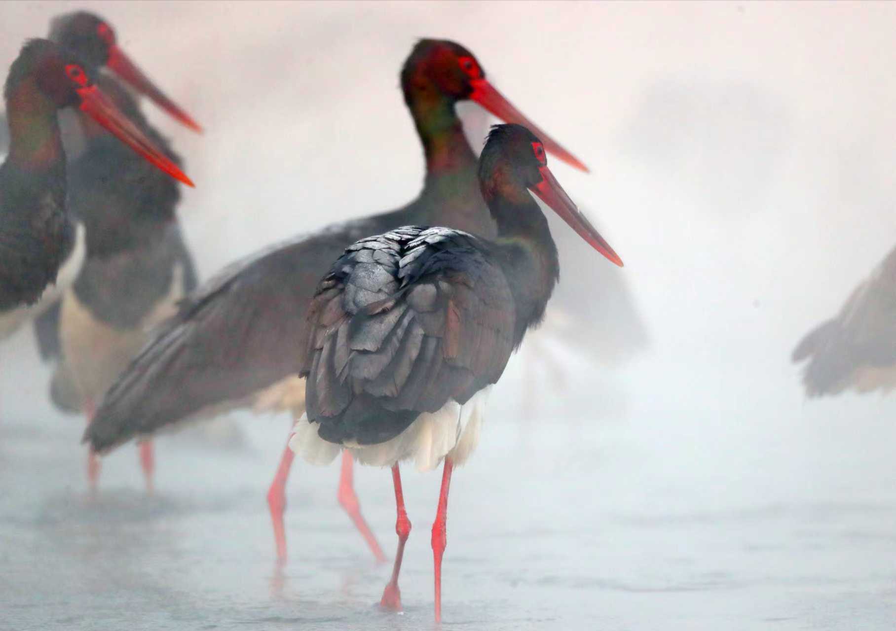 1月26日清晨,拒马河水面升腾起阵阵白雾。伴随着一缕缕阳光,黑鹳开始在河里捕食,相互打量、试探,展示优美的仪态。