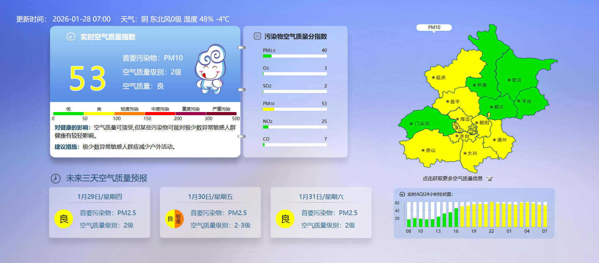 据北京市生态环境监测中心今早7时数据,目前实时空气质量指数53,首要污染物PM10,空气质量良。