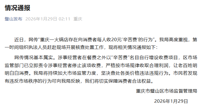 近日,网传“重庆一火锅店存在向消费者每人收20元‘辛苦费’的行为”。该局高度重视,第一时间组织执法人员赶赴现场开展核查处置工作,现将相关情况通报如下: