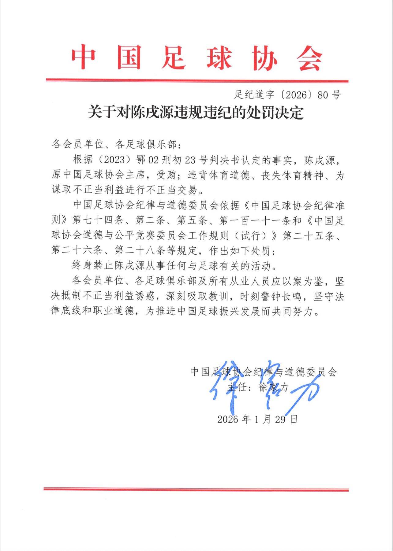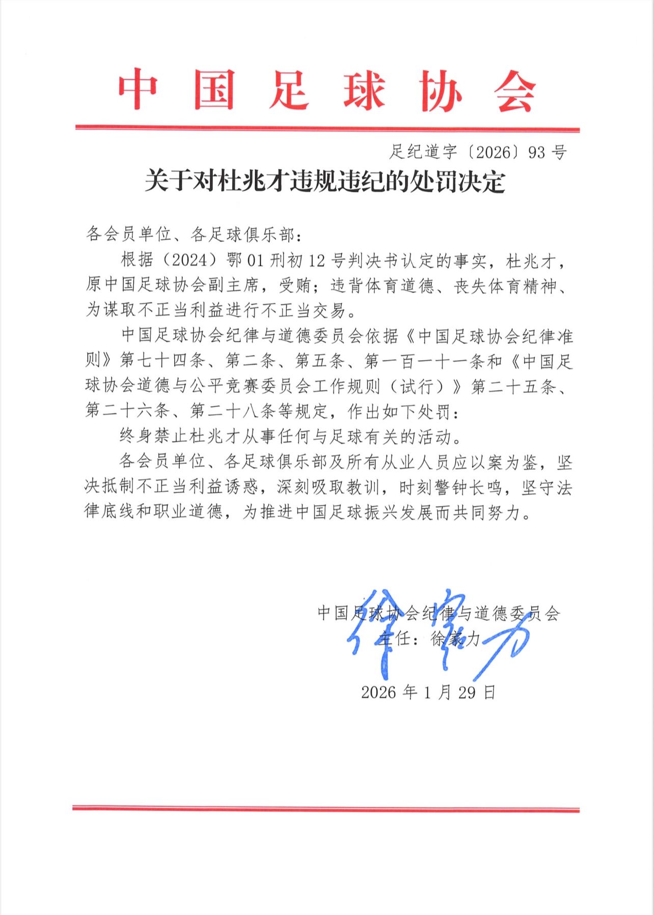 新京报讯 据中国足协消息,根据公安、司法部门向国家体育总局、中国足球协会移交的足球行业“假赌黑”问题案件材料,中国足球协会纪律与道德委员会对案件材料进行全面系统梳理,按照《中国足球协会纪律准则》等相关规定,完成对涉案俱乐部及涉案人员的行业处罚审议工作。为严肃行业纪律,净化足球环境,维护竞赛公平,现将处罚决定通报如下: