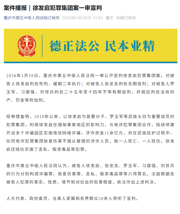 新京报讯 据重庆市第五中级人民法院订阅号消息,2026年1月30日,重庆市第五中级人民法院一审公开宣判徐发启犯罪集团案。对被告人徐发启判处死刑,缓期二年执行;对被告人张龙龙判处无期徒刑;对被告人罗玉军、习康强、刘世兵判处二十五年至十四年不等有期徒刑,并相应判处没收财产、罚金等附加刑。