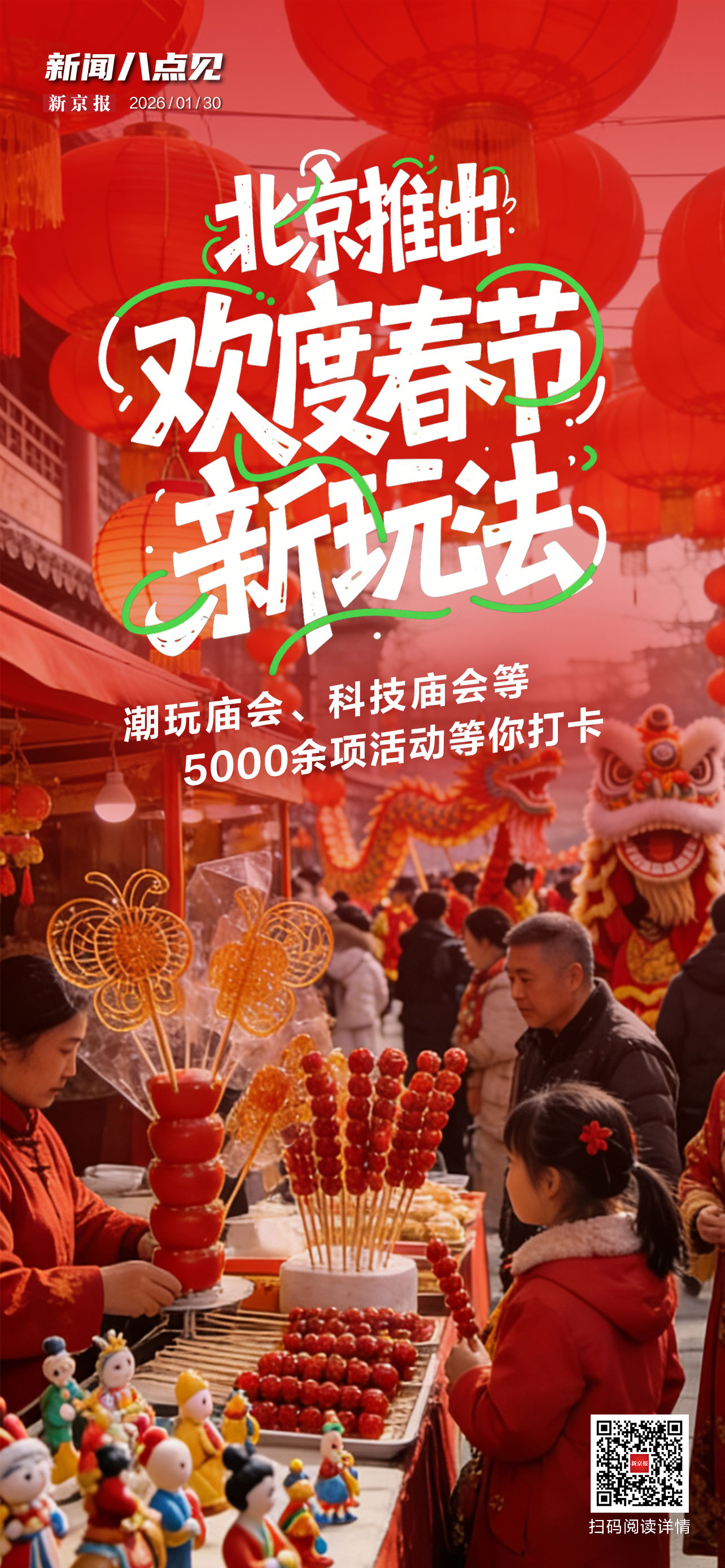 其中,庙会是最具北京特色的过年打卡方式。今年春节,全市将举办30余个庙会灯会,数量和规模都较往年有所提升。今年传统庙会有所升级,比如东城区的龙潭庙会和地坛庙会、西城区的厂甸庙会增加了更多现场演出,包括曲艺、相声、特色杂技、武术等,营造更加丰富多元的春节氛围。同时,各区也积极因地制宜,推出许多特色庙会,比如丰台宛平城首创梨园庙会,打造户户有戏的沉浸式体验;朝阳区契合年轻朋友的需求,首创潮玩庙会;海淀区在五棵松商圈升级举办科技庙会等。夜幕降临后,延庆“非遗花灯+龙庆峡冰灯”、世界公园新春彩灯嘉年华等各类大型灯会将登场。阅读全文>>>