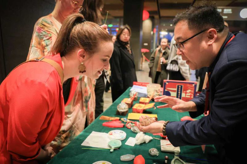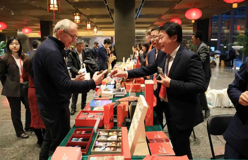 招待会现场还设有北京各区的外宣品展示区域。西城区展台前,外国记者观看展品。