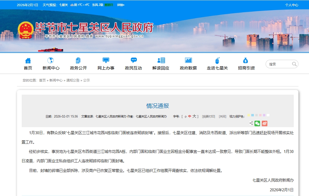 新京报讯 2月1日,贵州毕节七星关区人民政府新闻办发布情况通报:1月30日,有群众反映“七星关区三江城市花园A栋临街门面被连夜砌砖封堵”。接报后,七星关区住建、消防及市西街道、派出所等部门迅速赶赴现场开展核实处置工作。