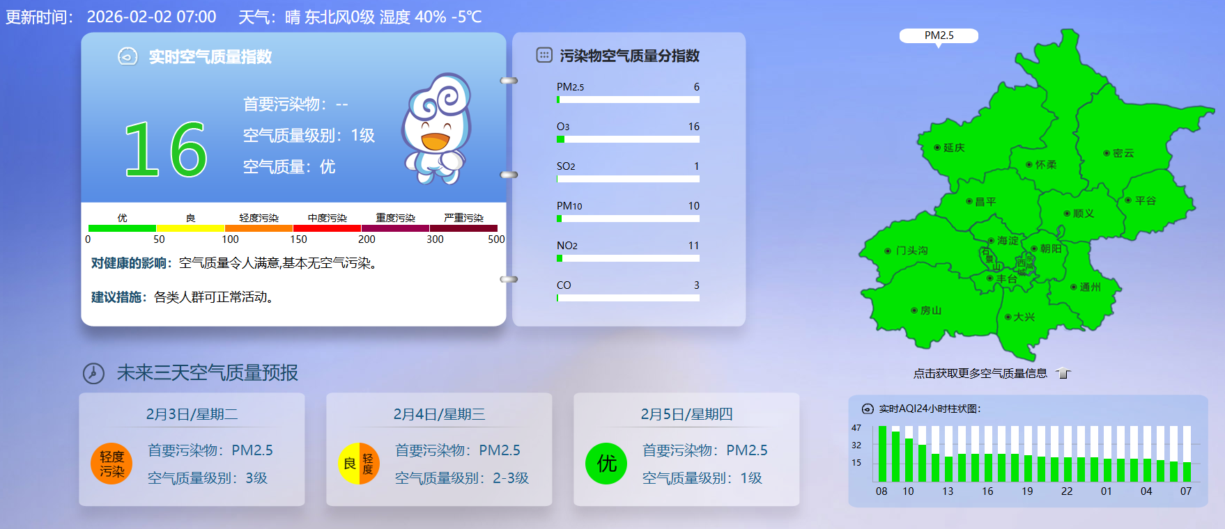 据北京市生态环境监测中心今早7时数据,目前实时空气质量指数16,空气质量优。