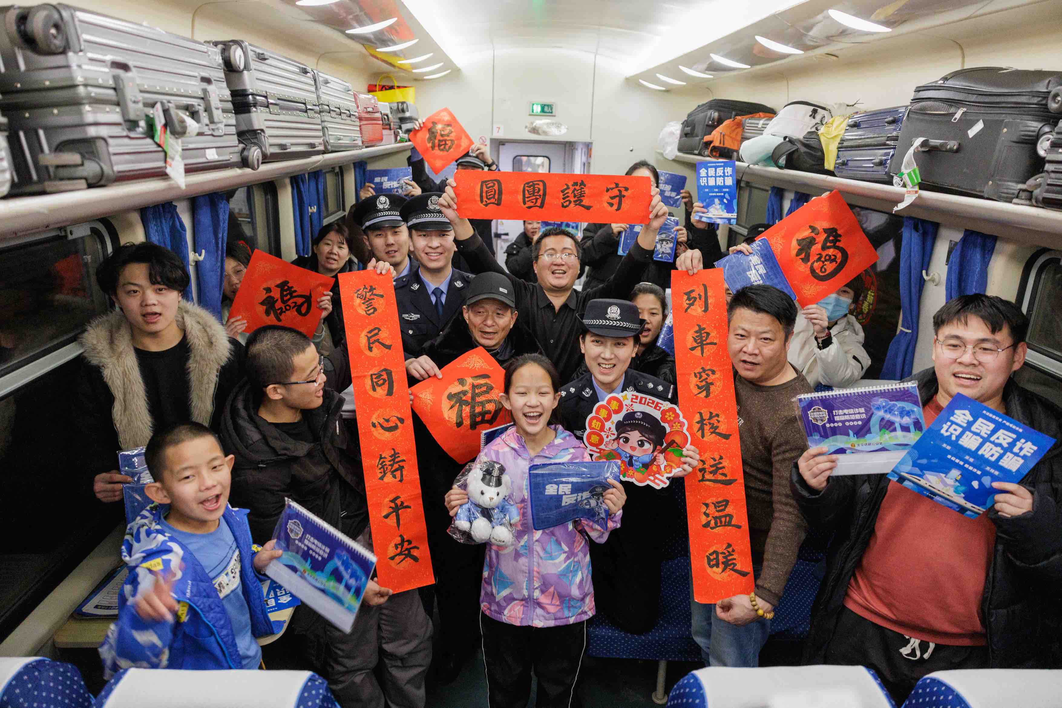 2月2日0时40分,随着列车逐渐驶出站台,在K4069次列车上,“铁警相伴,平安相随”主题宣传活动在车厢内展开。来自北京铁路公安处乘警支队的“春运宣传小分队”成员,用一堂生动的“移动安全课”,为踏上归途的旅客送上了实用的平安“锦囊”。据悉,这支小分队由“乘警榜样”和业务骨干民警组成,旅客在乘车过程中不仅能学习安全乘车知识和防范电信网络诈骗的技巧,在有奖问答互动环节,还能获得2026年反诈台历和民警写下的马年福字、对联等礼品。