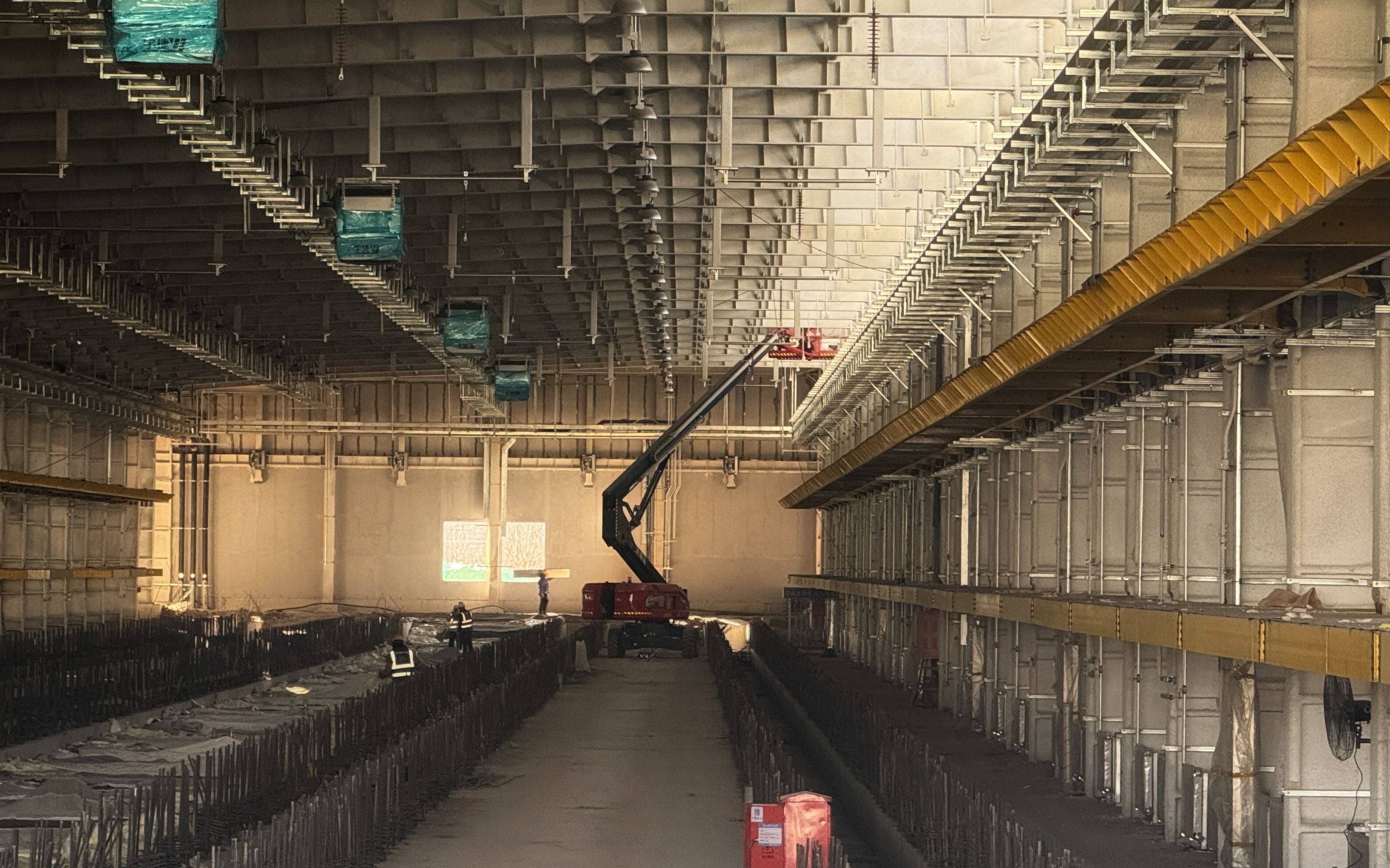“目前,运用库、洗车库、工程车库、综合楼等主要单体建筑主体结构已全部封顶。设备安装工程正穿插进行,其中铺轨完成约72%,风水电等机电安装完成约48%,接触网、通信信号等系统专业施工也已顺利展开,项目建设正从土建结构全面转向机电安装与装饰装修阶段。”翟锡栋说。