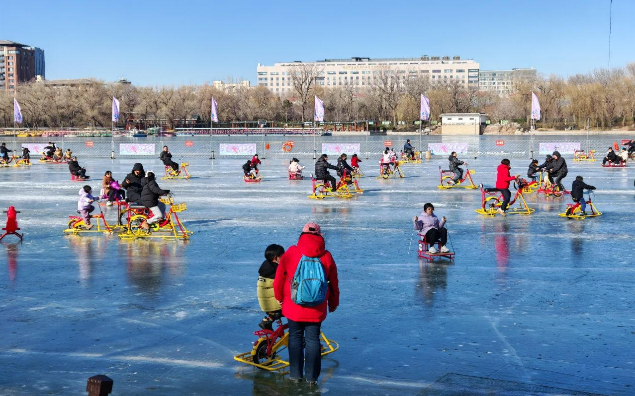 今年市属公园冰场的另一大亮点是——玉渊潭公园时隔六年再次开放冰场,还推出了马年限定款“马拉冰车”项目。2月2日下午1点,冰场人头攒动,电动冰车清脆的铃声此起彼伏,孩子们把冰上自行车蹬得飞快,追逐嬉戏之间,上演极限漂移。
