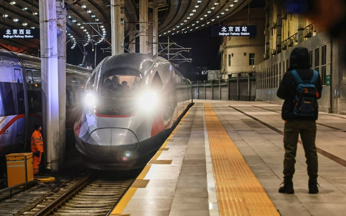 ▲1月26日早上,京津冀地区首趟环线高铁G8859次列车从北京西站发车,该列车将直接服务前往雄安新区的通勤旅客。新京报记者 郭延冰 摄