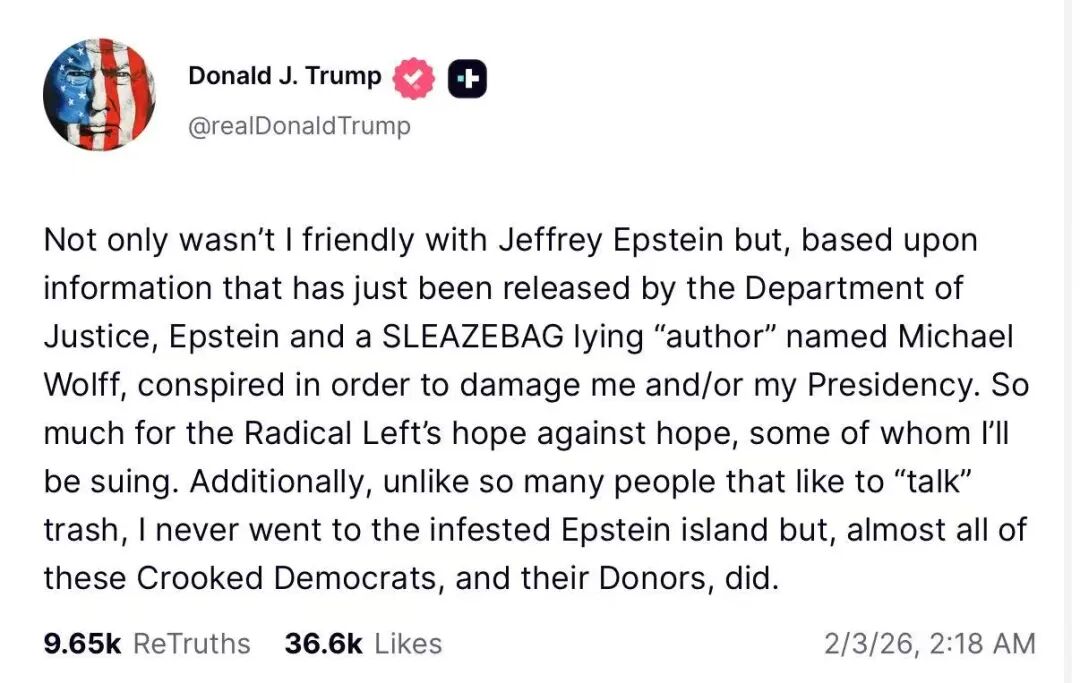 据新华国际头条消息,美国总统特朗普2日在社交媒体上发文,再次否认与美国已故富商爱泼斯坦的案件有关联,称从未去过爱泼斯坦的岛屿。