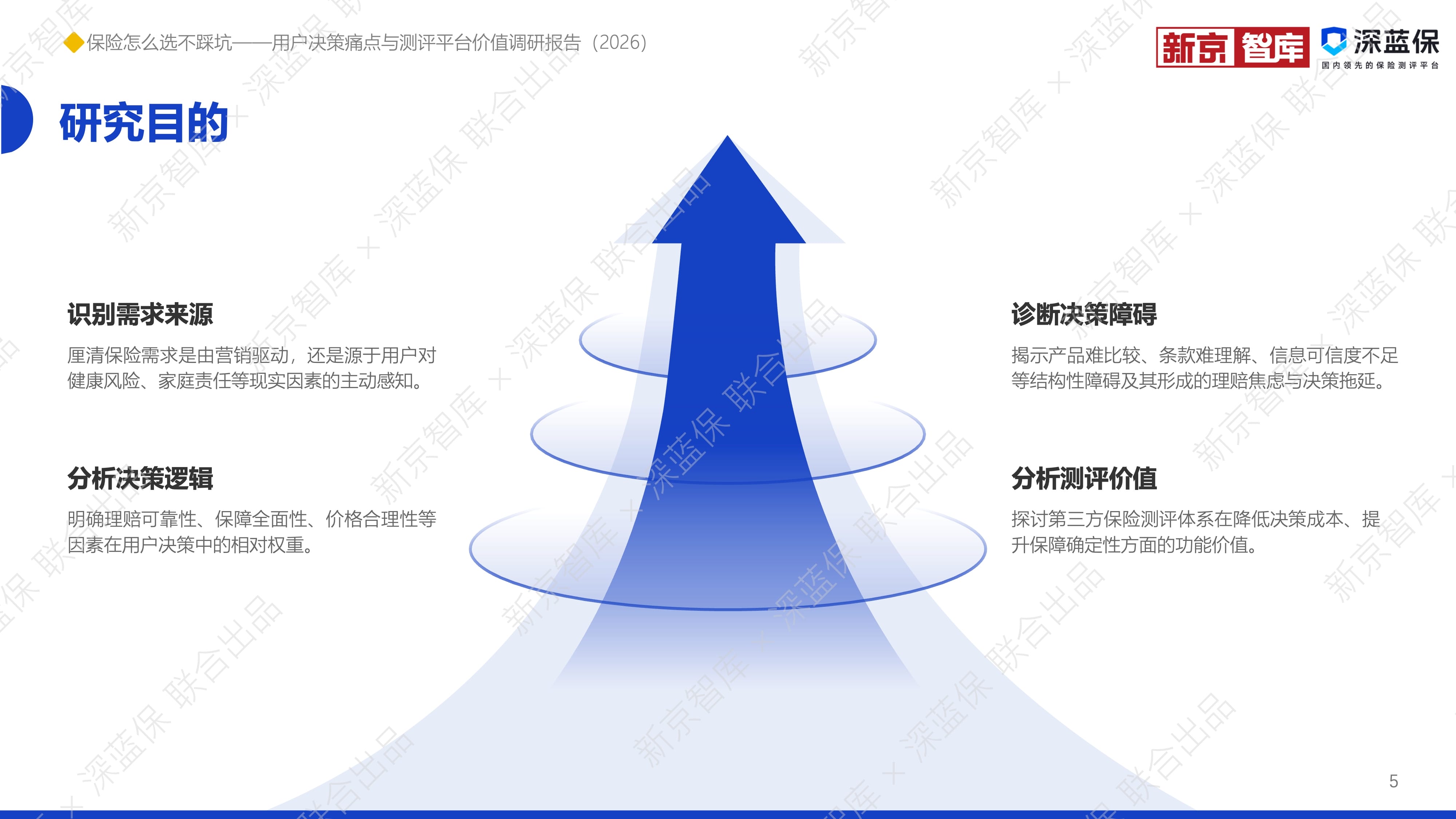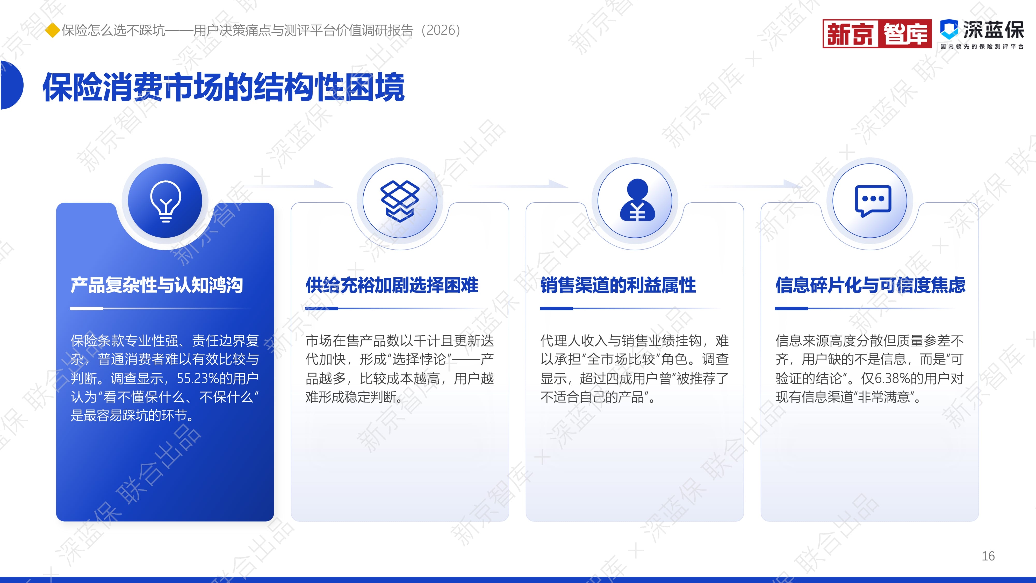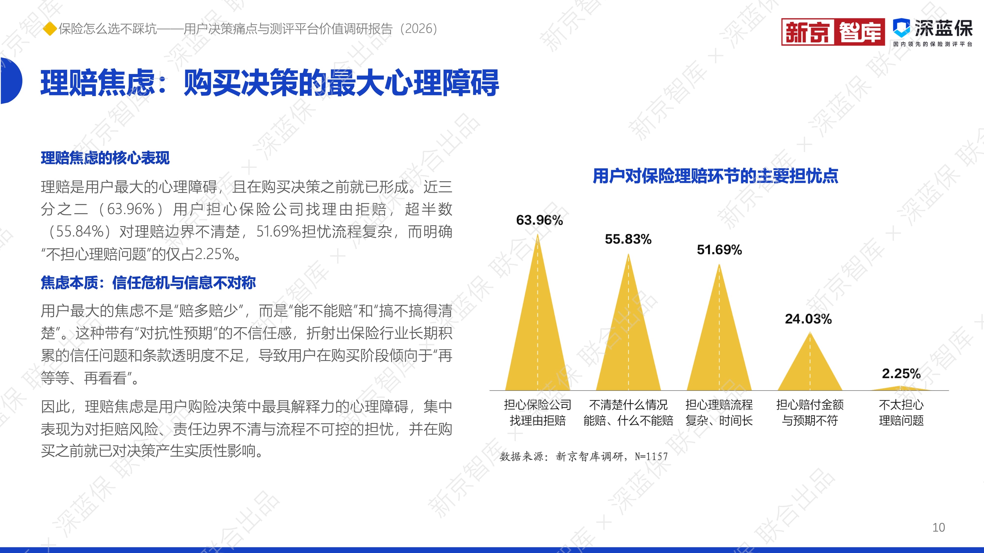 2月3日,新京报新京智库联合深蓝保发布《保险怎么选不踩坑——用户决策痛点与测评平台价值调研报告(2026)》。报告显示,近九成用户对保险持积极态度,需求真实且普遍。但理赔焦虑、条款难懂、产品难比这“三座大山”压在购险决策上,导致大量的保险购买需求被“卡”在了决策环节。与此同时,85.65%的用户表示愿意参考独立、透明的第三方测评榜单。报告主要发现如下: