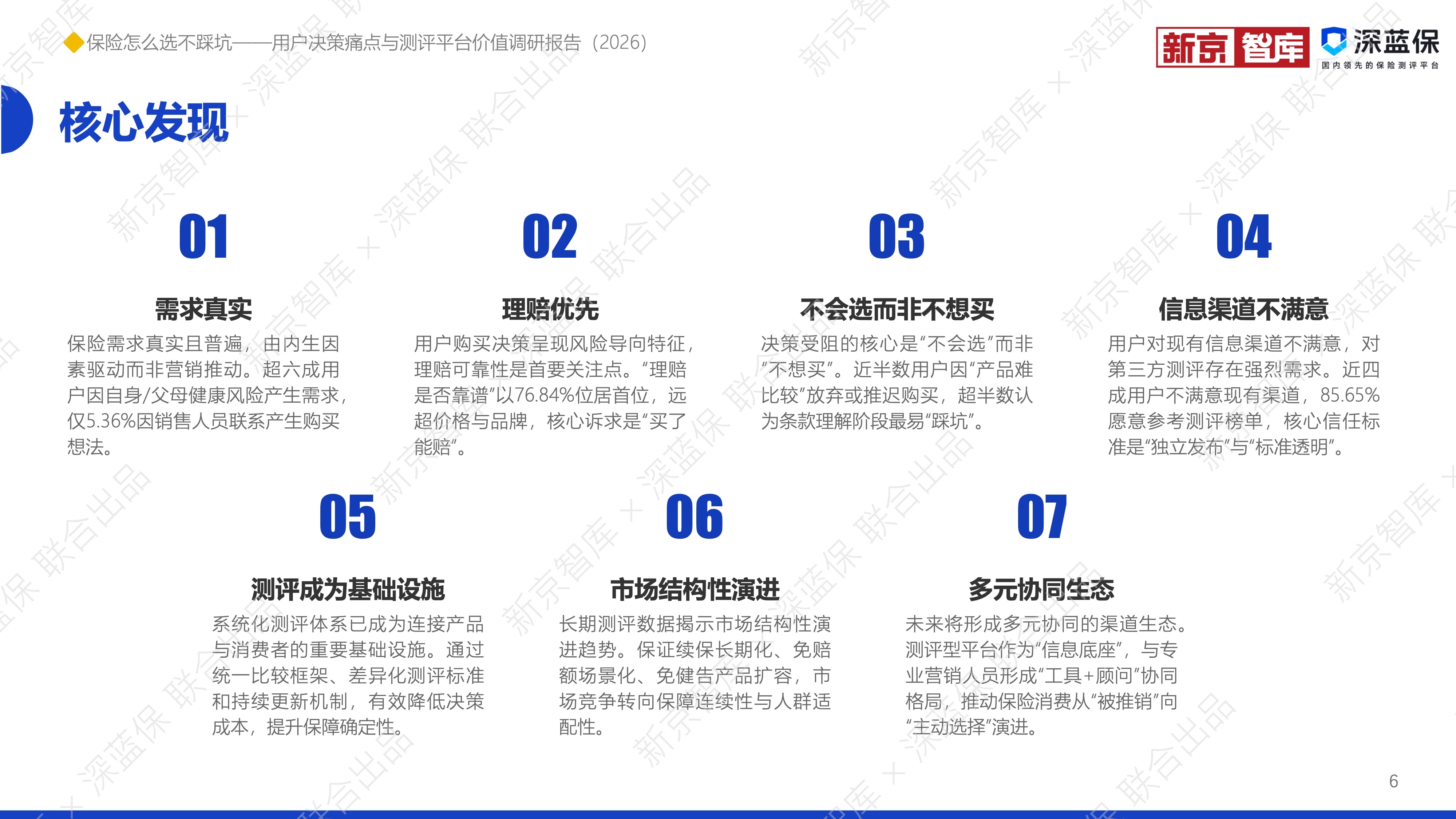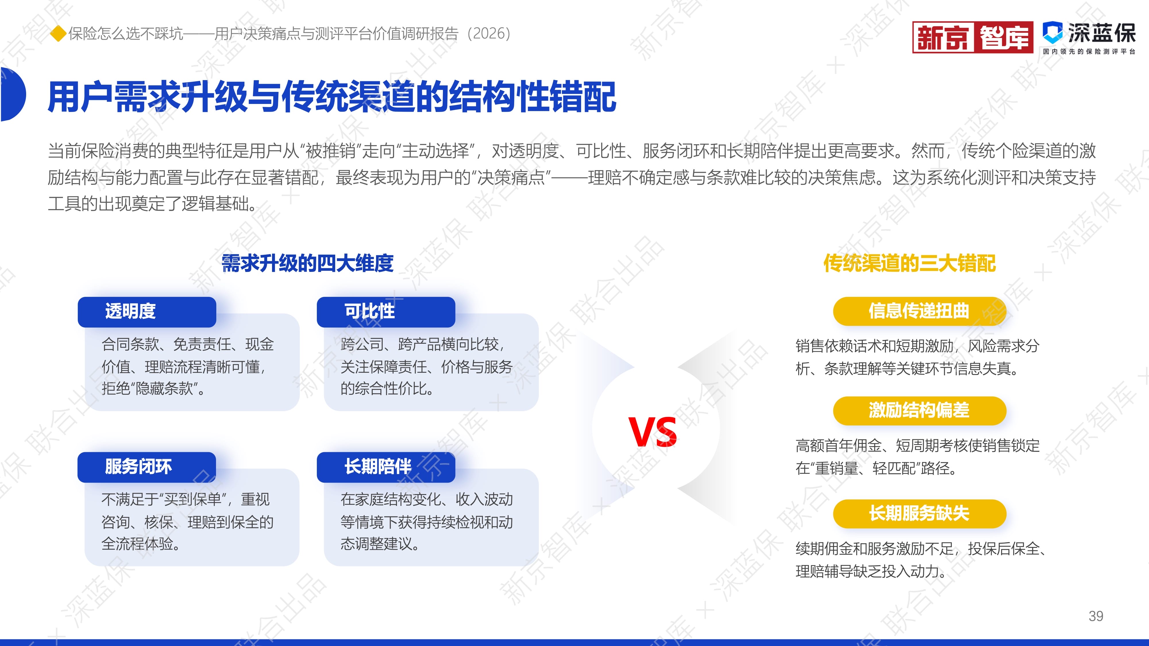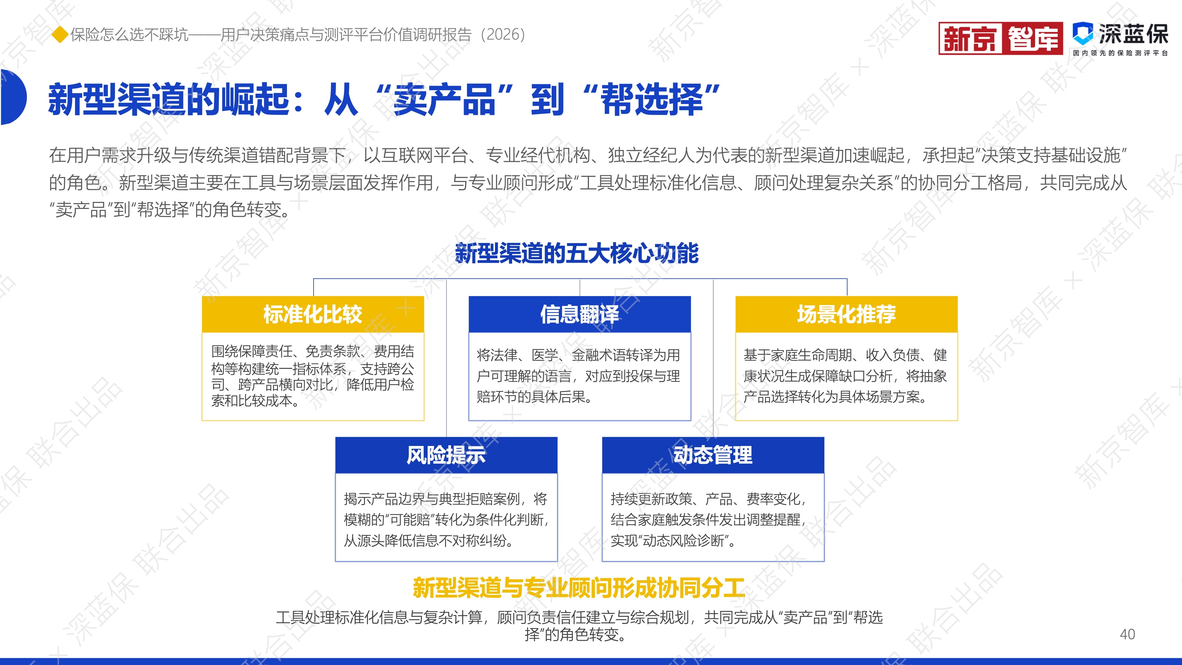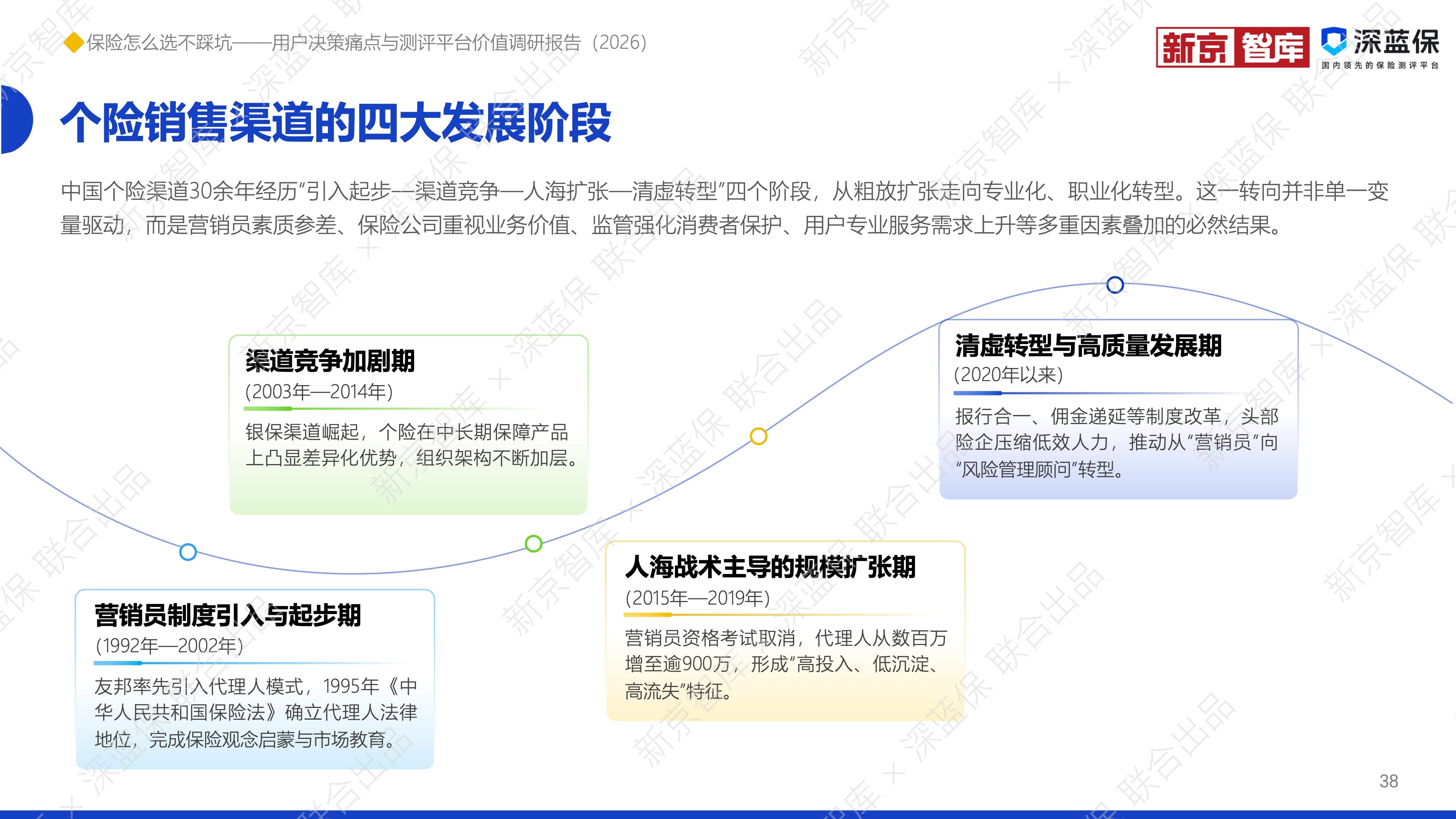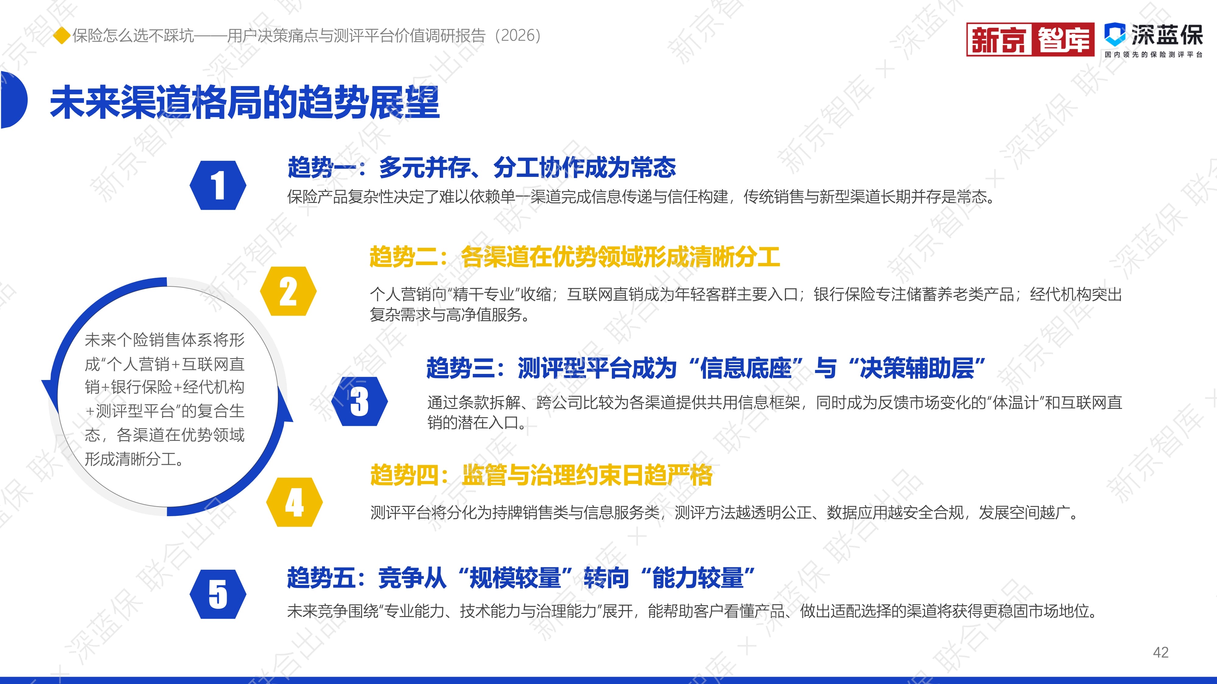 七、未来保险销售体系将形成多元协同的渠道生态。个人营销、互联网直销、银行保险、经代机构与测评型平台将在各自优势领域形成更清晰的分工,测评型平台作为“信息底座”和“决策辅助层”,与专业营销人员形成“工具处理标准化信息、顾问处理复杂关系”的协同格局,共同推动保险消费从“被推销”向“主动选择”演进。