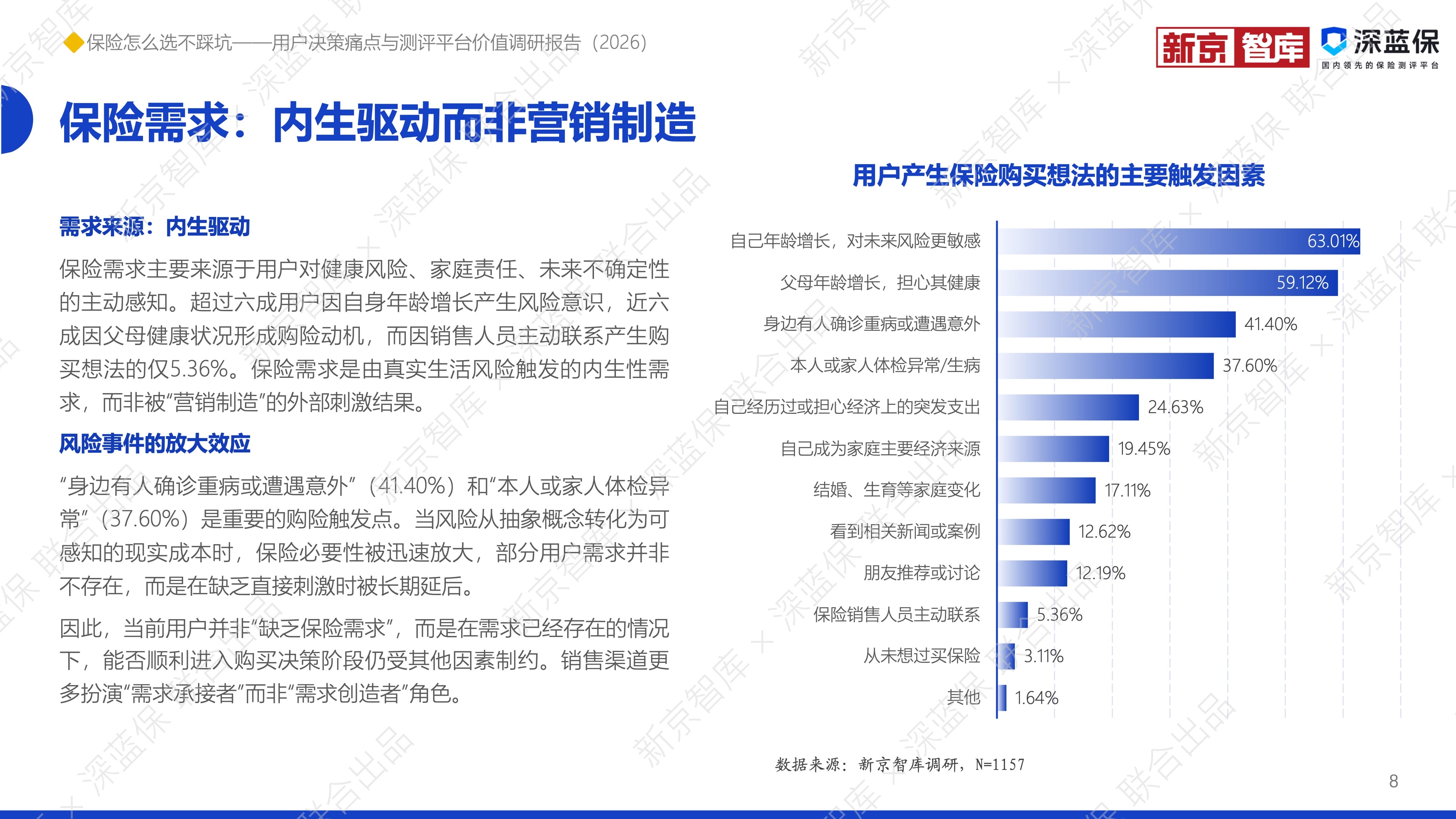 一、保险需求真实且具有普遍性,主要由用户对健康风险与家庭责任的主动感知所驱动,而非营销推动的结果。调查显示,超过六成用户因自身年龄增长产生风险意识,近六成用户因父母健康状况形成购险动机,而因销售人员主动联系产生购买想法的比例仅为5.36%。