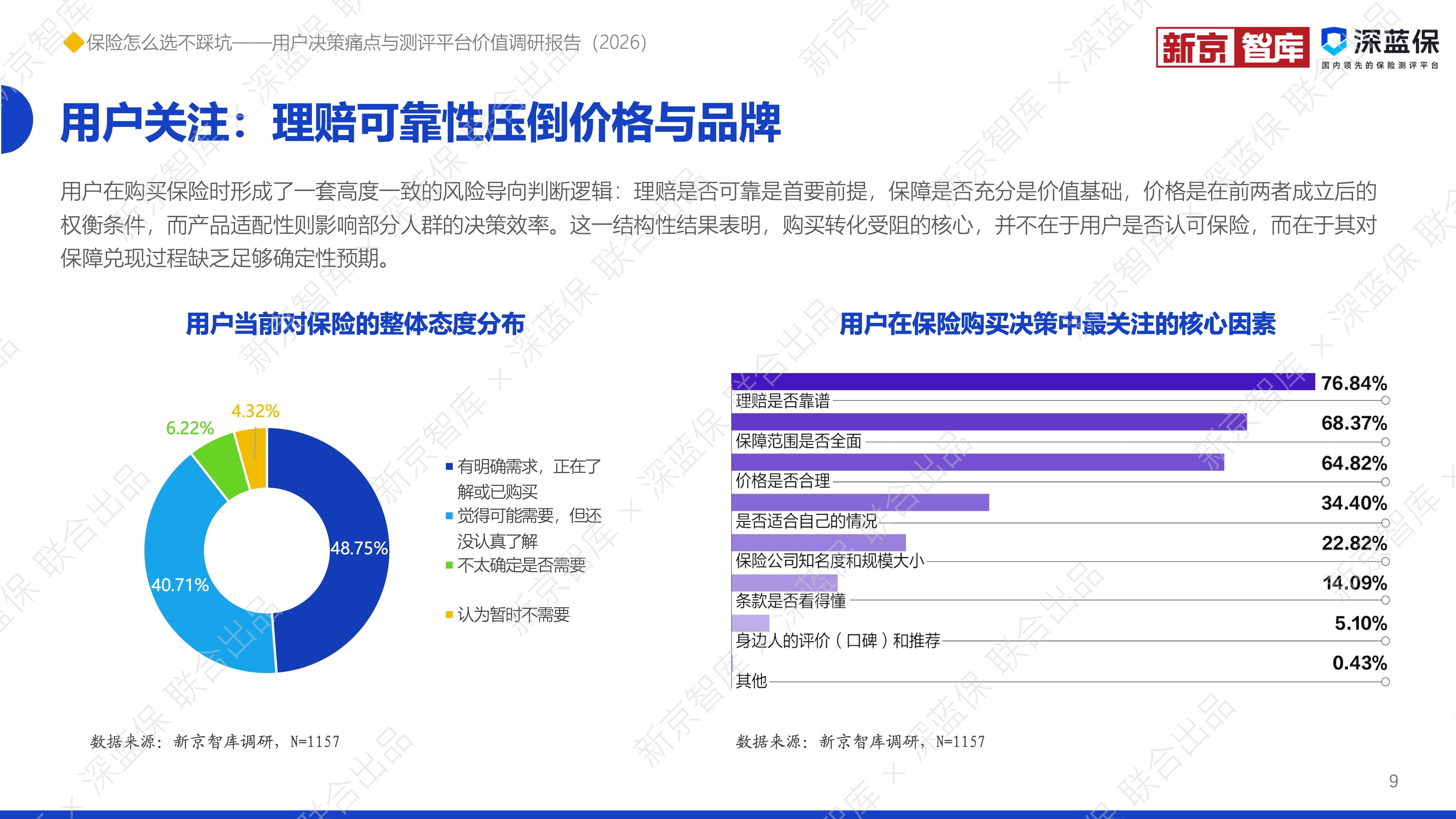 二、用户购买决策呈现高度一致的风险导向特征,理赔可靠性是首要关注点。“理赔是否靠谱”以76.84%的选择率位居用户关注因素首位,明显高于价格与品牌知名度,表明用户对保险的核心诉求是“买了能赔”。