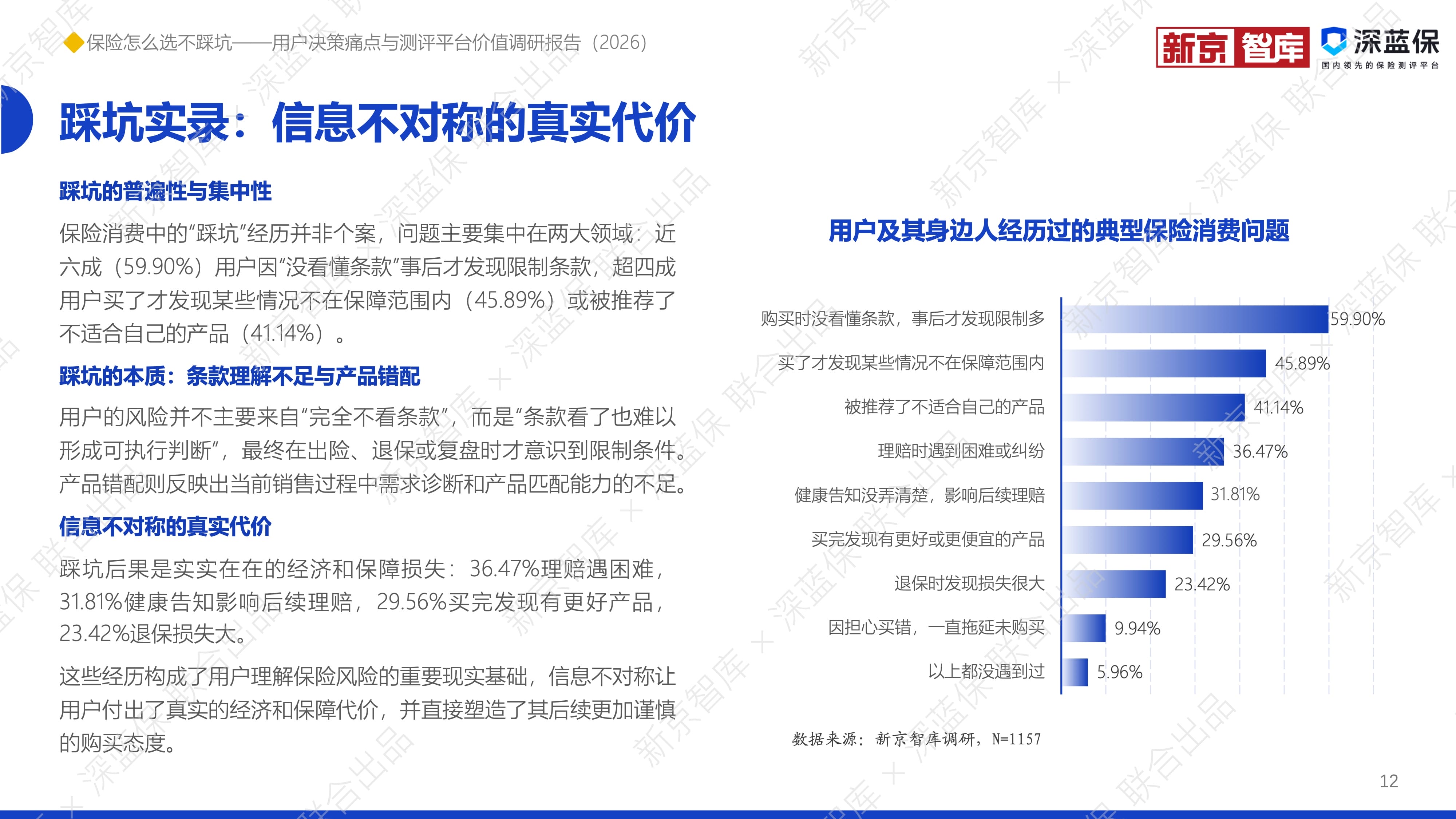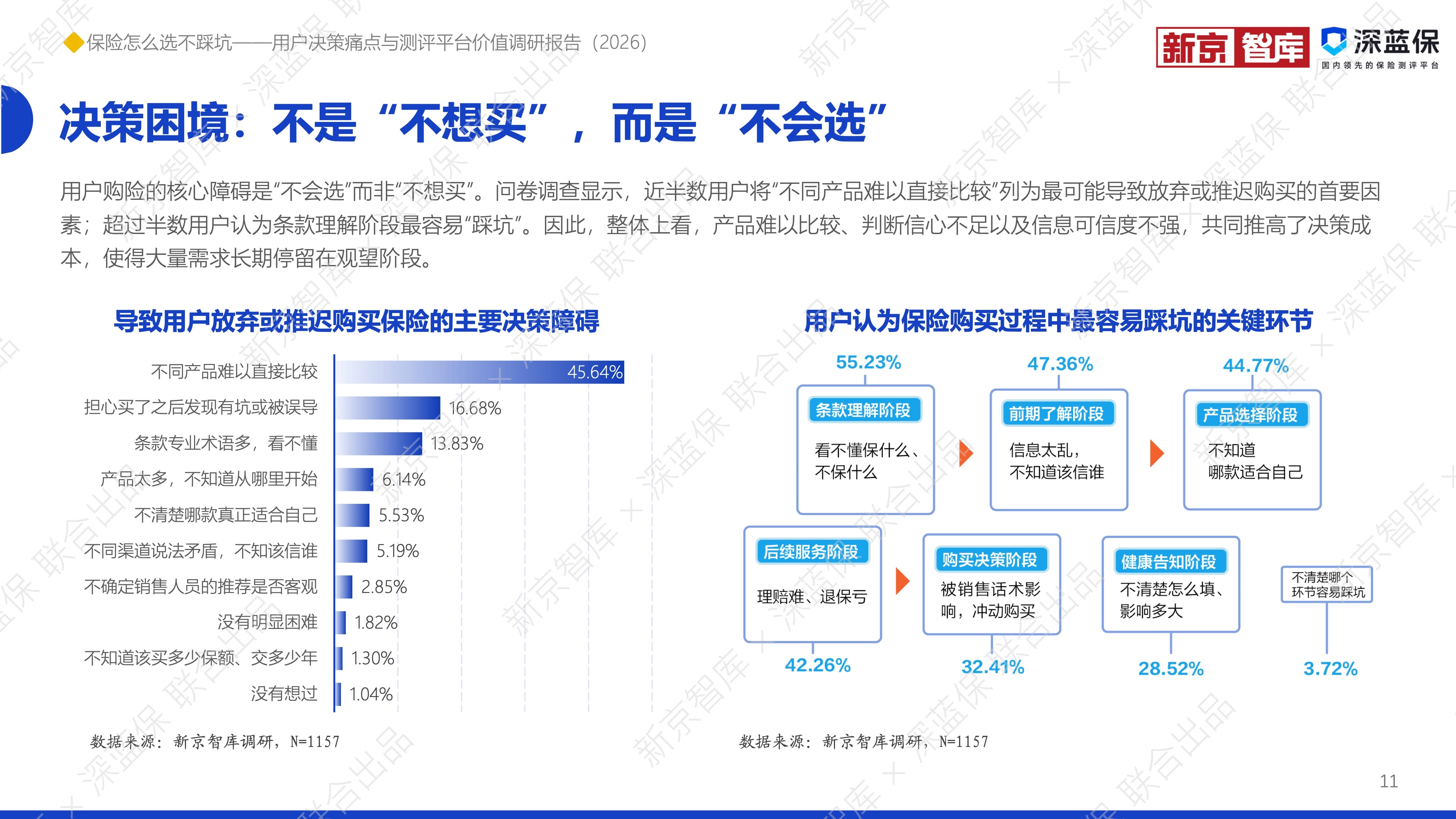 三、用户购险决策长期受阻的核心原因是“不会选”而非“不想买”。近半数用户将“不同产品难以直接比较”列为放弃或推迟购买的首要因素,超过半数用户认为条款理解阶段最容易“踩坑”。