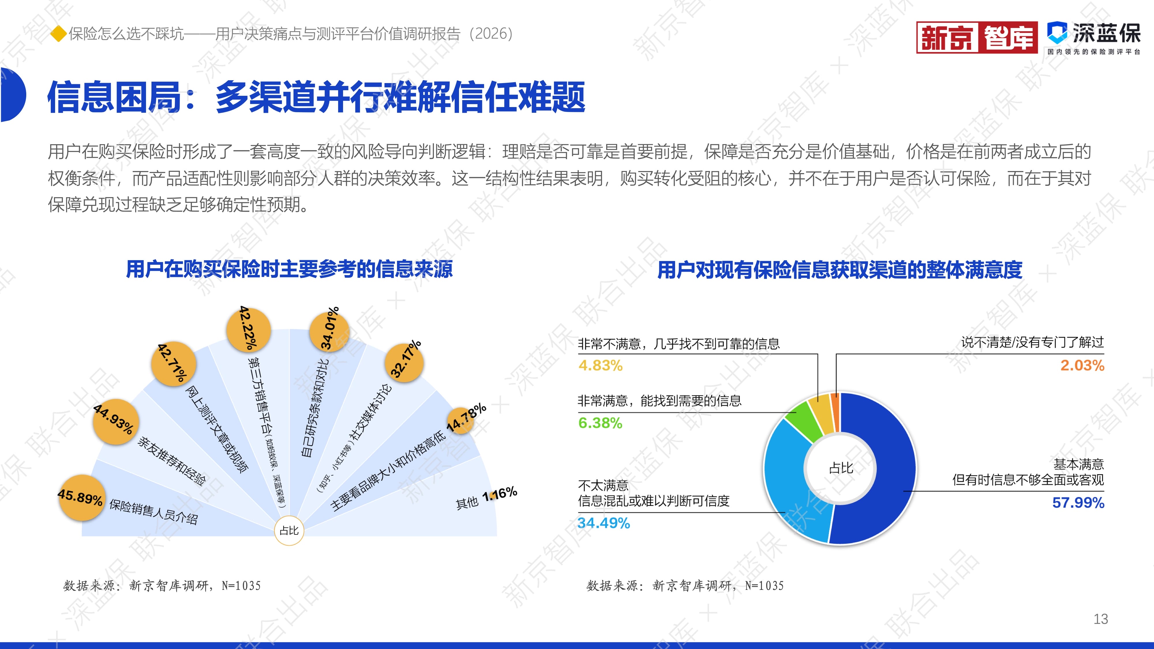 四、用户对现有信息渠道满意度普遍不高,对独立、透明的第三方测评工具存在强烈需求。近四成用户对现有信息渠道表示不满意,而85.65%的用户表示愿意参考长期运营的保险测评榜单,用户判断测评可信的核心标准是“由第三方独立机构发布”与“测评标准公开透明”。