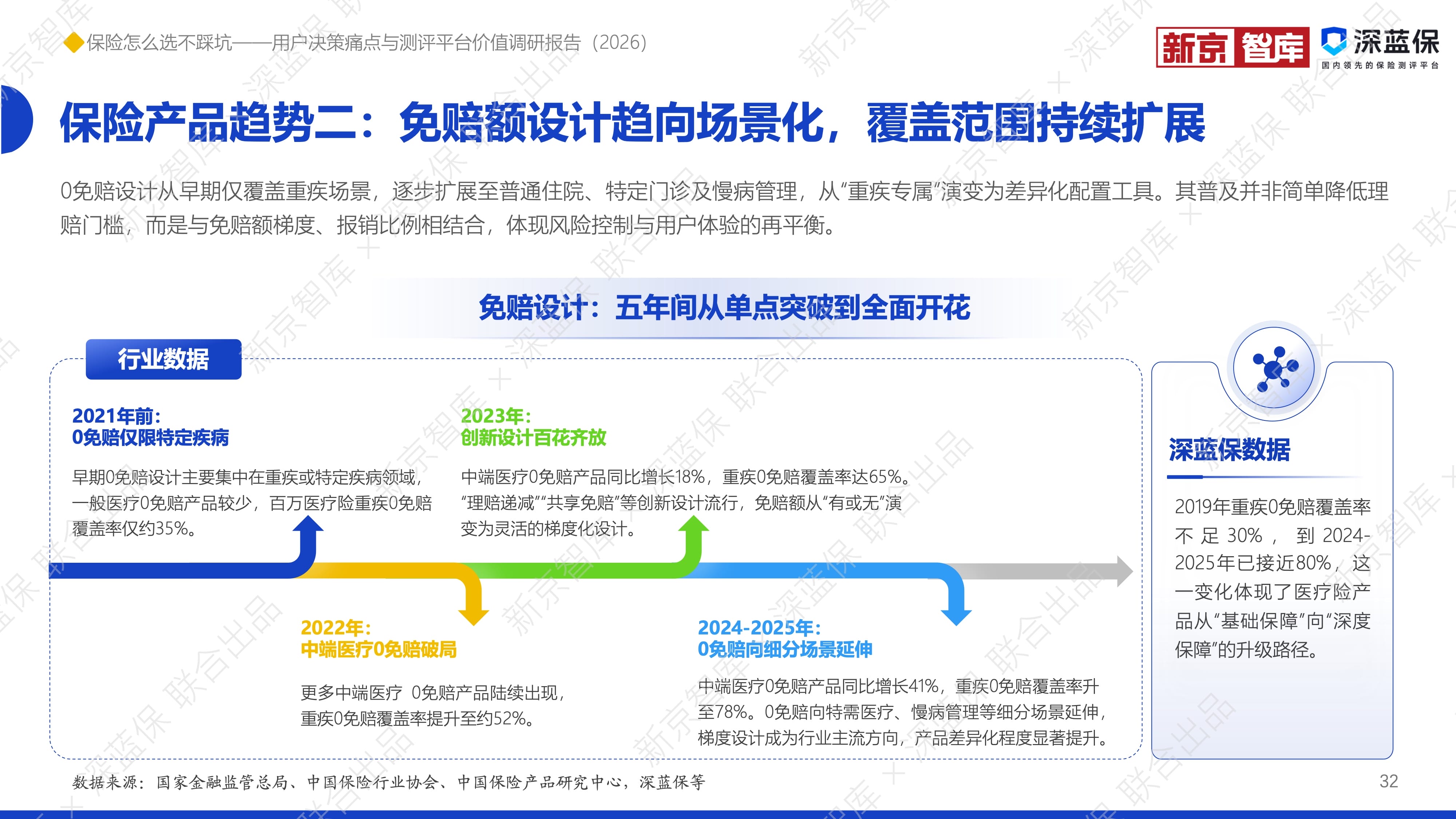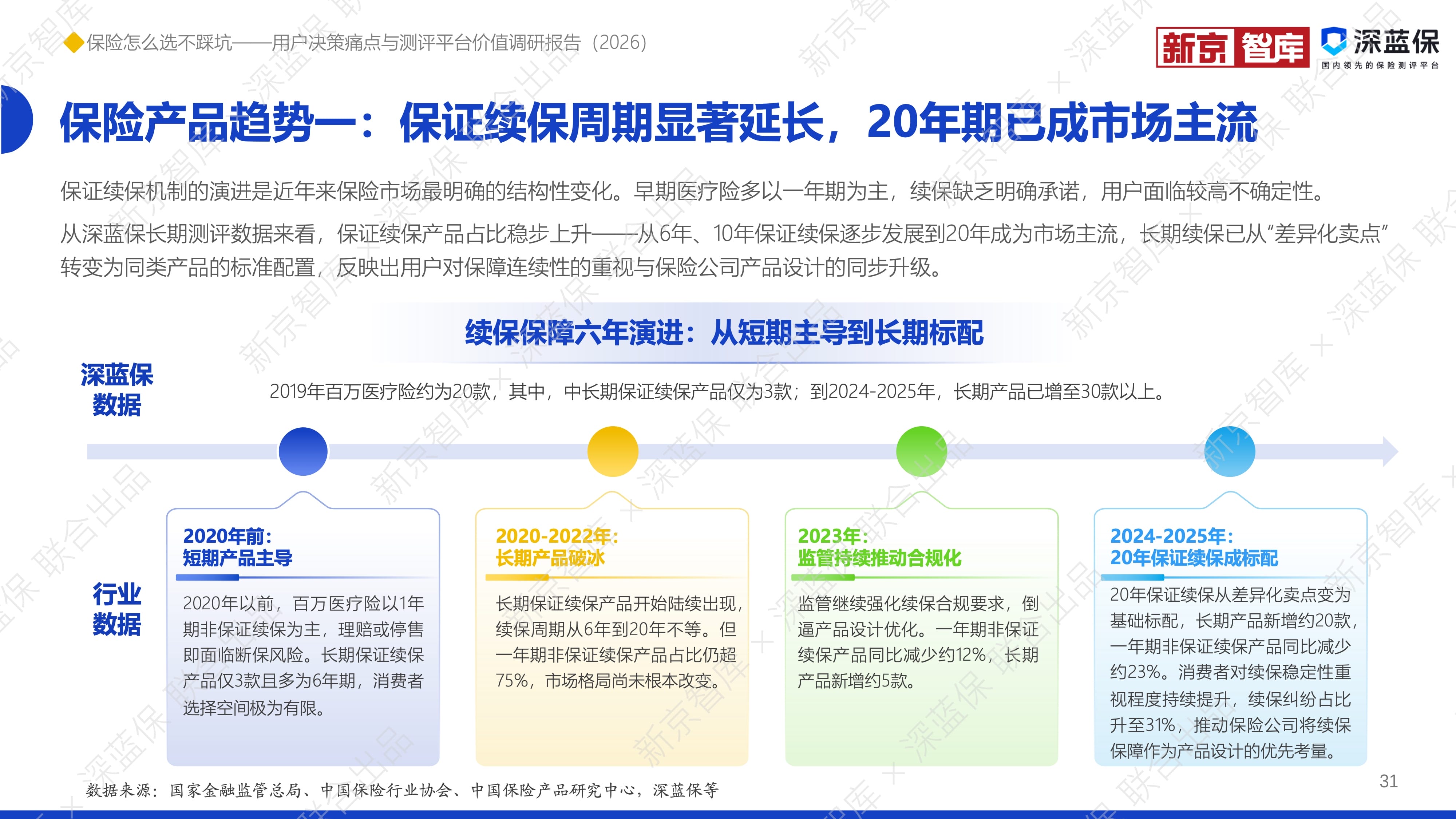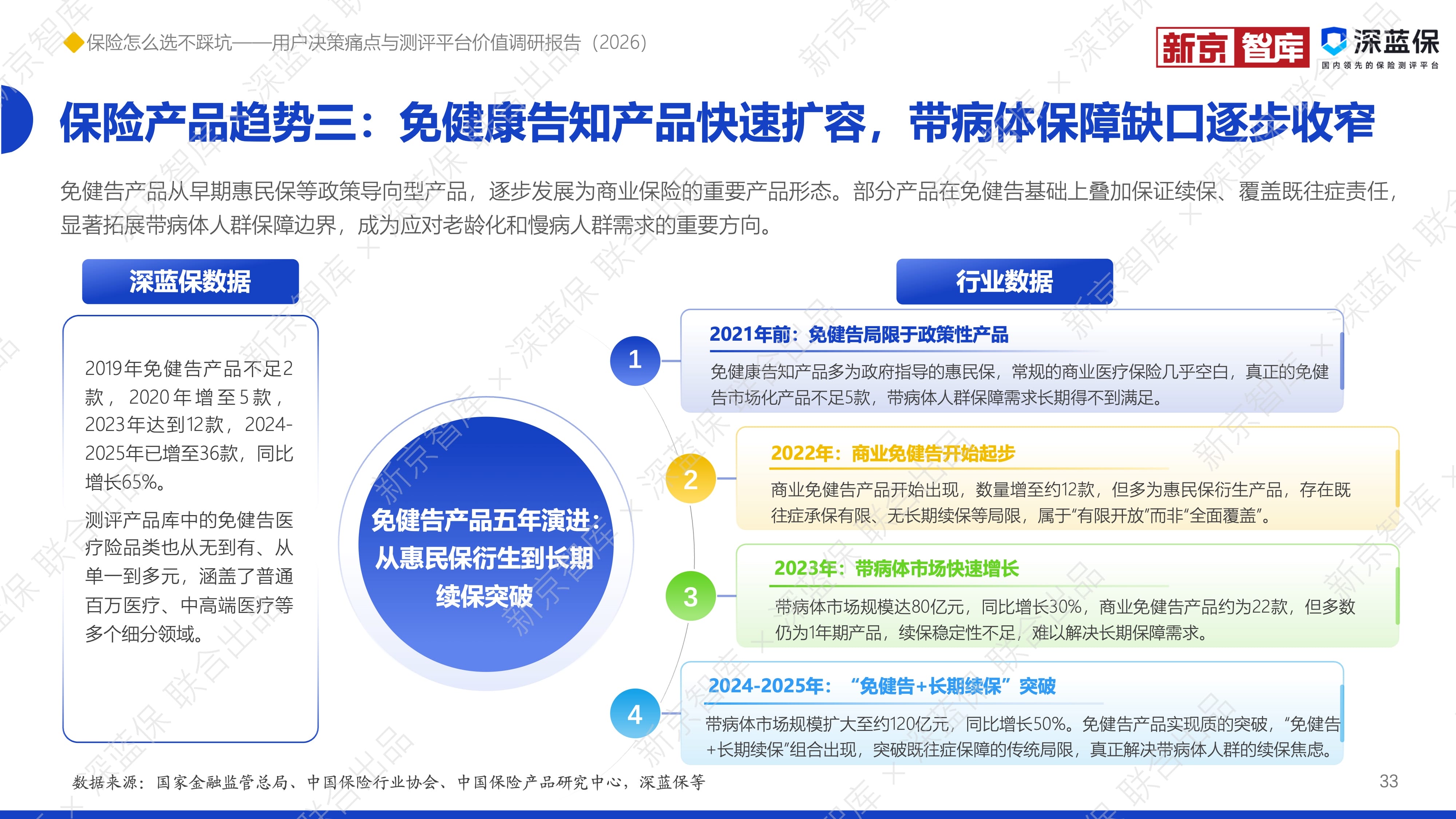六、长期测评数据揭示了保险市场的结构性演进趋势。保证续保机制的长期化、免赔额设计的场景化扩展、免健康告知产品的快速扩容,表明市场竞争正从短期卖点比拼转向以保障连续性、可赔性和人群适配性为核心的新阶段。