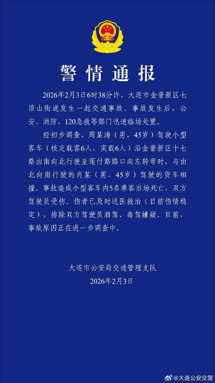 大连金普新区发生一起道路交通事故致5死2伤 驾驶员排除酒驾毒驾