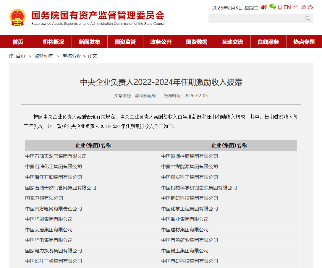 新京报讯 据国资委消息,按照中央企业负责人薪酬管理有关规定,中央企业负责人薪酬总收入由年度薪酬和任期激励收入构成,其中,任期激励收入每三年发放一次。现将中央企业负责人2022-2024年任期激励收入公开如下: