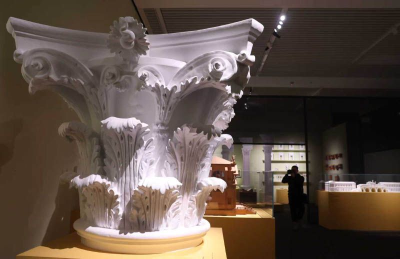 展览通过“奠基——古典的测量师”“巅峰——伟大的建筑师”“对话——世界的帕拉第奥”三个单元,完整梳理这位巨匠从意大利维琴察走向世界的创作历程,揭示出从“古典”淬炼为“经典”的创造之路。展览展出的威尼斯救世主教堂科林斯柱头模型。