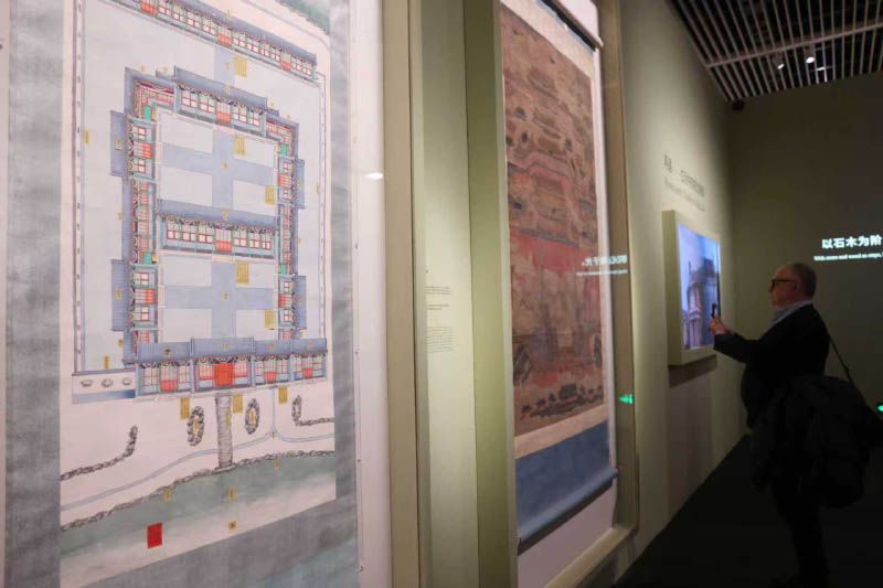 本次展览特别展出中国传统建筑相关文物珍品。图为观众参观圆明园中路天地一家春立样图。