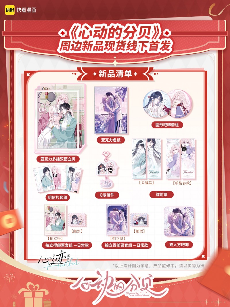 2月1日起,《心动的分贝》系列周边在快看漫画谷店、快闪店及阅文好物、饭沫宇宙等线上线下多渠道同步发售。从角色立牌、吧唧到主题色纸,每一件衍生品都精准承接了粉丝将情感投射于实体的渴望。