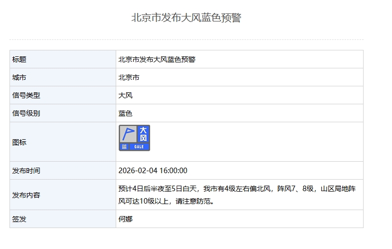 新京报讯 据北京市气象局网站消息,北京市发布大风蓝色预警:预计4日后半夜至5日白天,我市有4级左右偏北风,阵风7、8级,山区局地阵风可达10级以上,请注意防范。