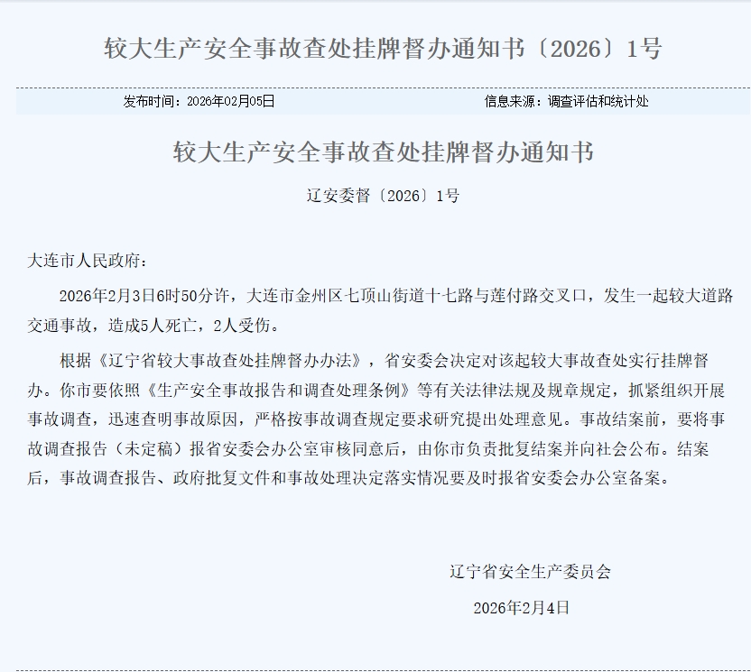 大连发生5死2伤较大交通事故,辽宁安委会挂牌督办