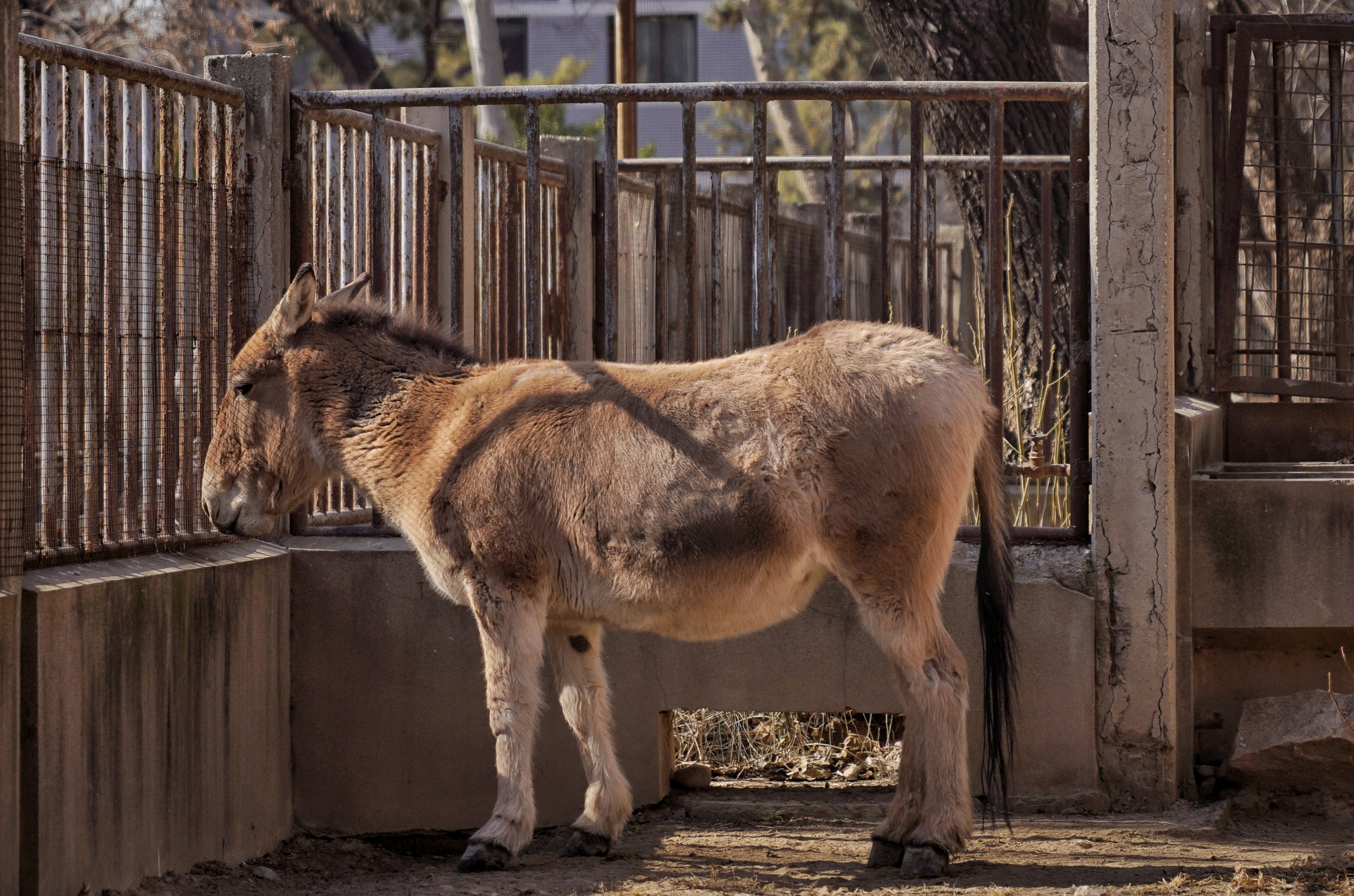 但从兽舍的“高规格”不难猜出它的独特地位。这是一个带有两间运动场的大兽舍,可供它敞开了溜达。院中央有一棵高大的梧桐树,尽管冬日繁花落尽,但从纵横交错的枝干便可想象出它枝繁叶茂的样子。夏天,梧桐树会洒下一大片阴凉,供普氏野马休息。