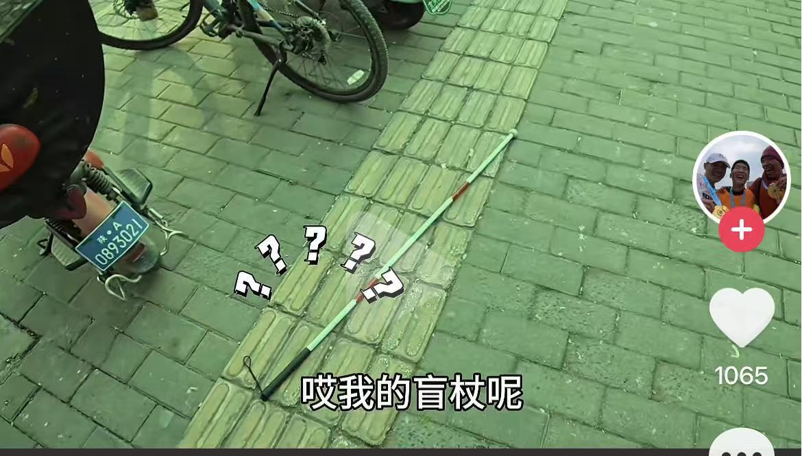 (来自社交媒体视障博主@谭走鱼尾纹视频作品:电动自行车停在盲道,导致该博主撞倒,后博主将车扶起,因为双手扶车,找不到丢在地上的盲杖)