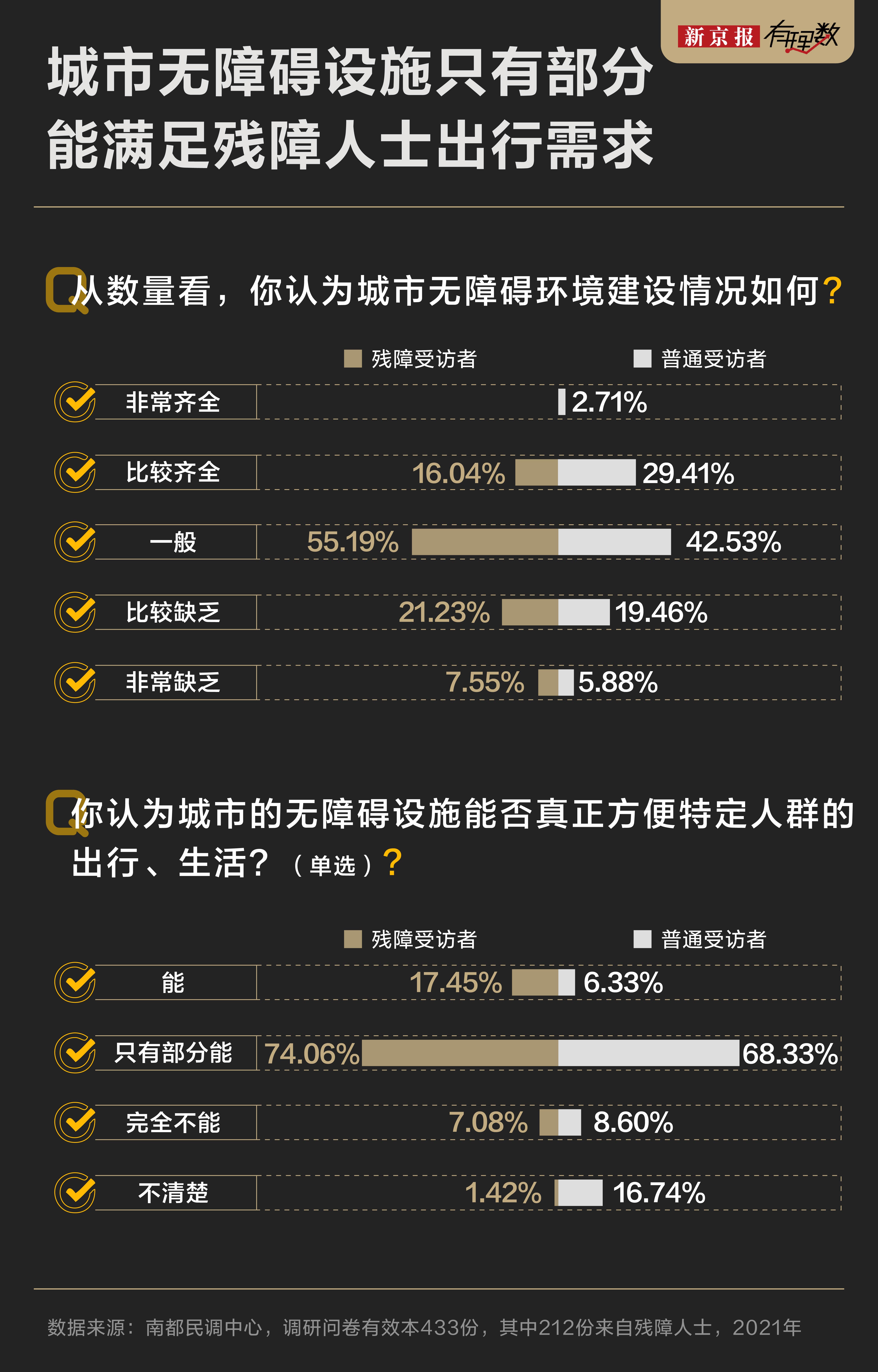 城市的无障碍设施现状,残障人群的感受最真切。在相关调研中,觉得城市无障碍设施特别全的比例很低,大多人觉得也就一般,还有不少人觉得设施挺缺乏的。