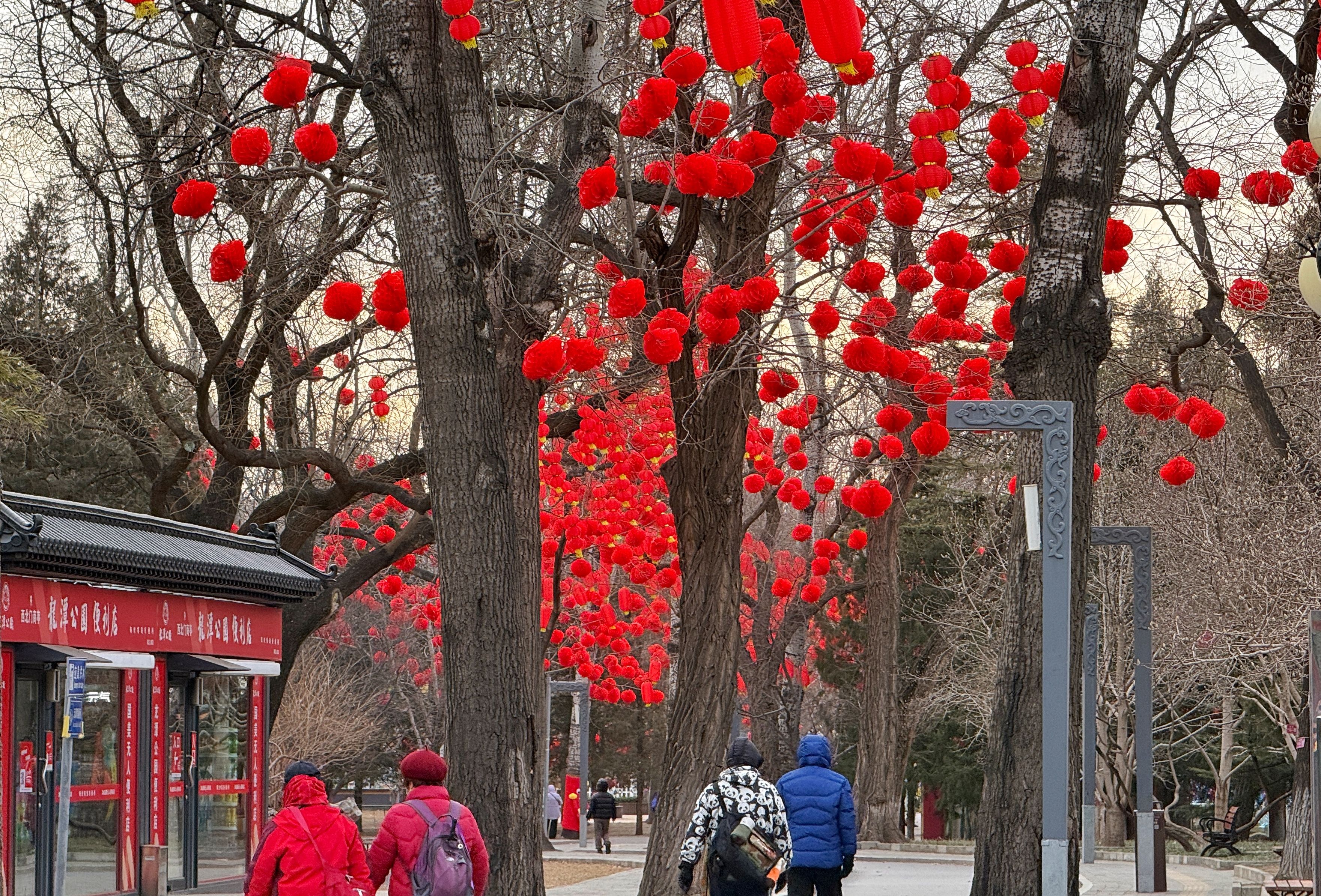 龙潭公园树上挂满红色灯笼。新京报记者 王贵彬 摄