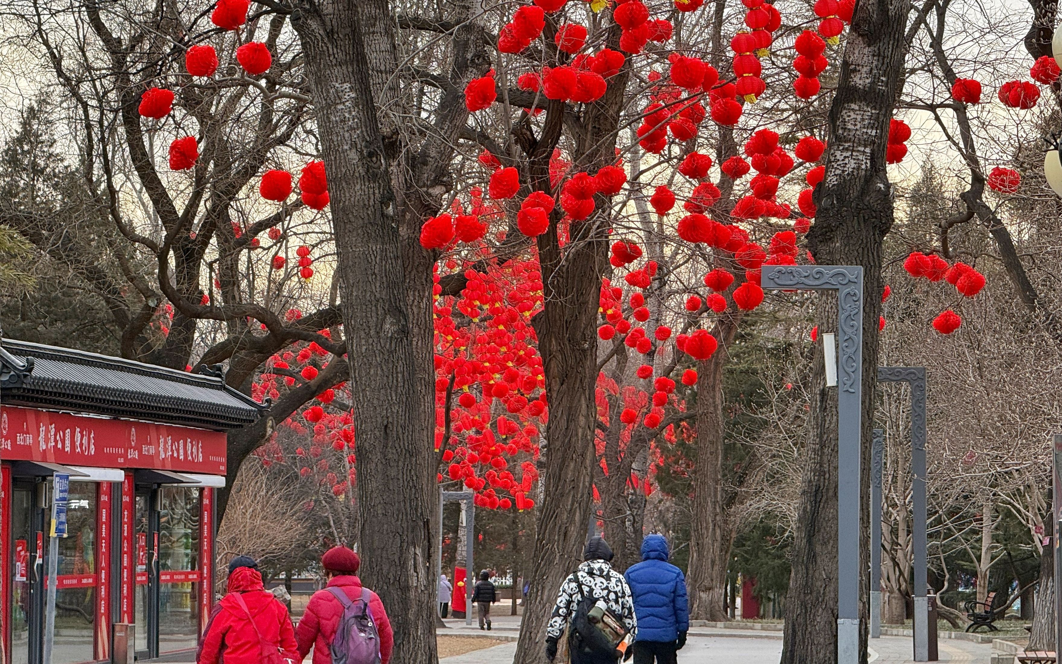 龙潭公园树上挂满红色灯笼。新京报记者 王贵彬 摄