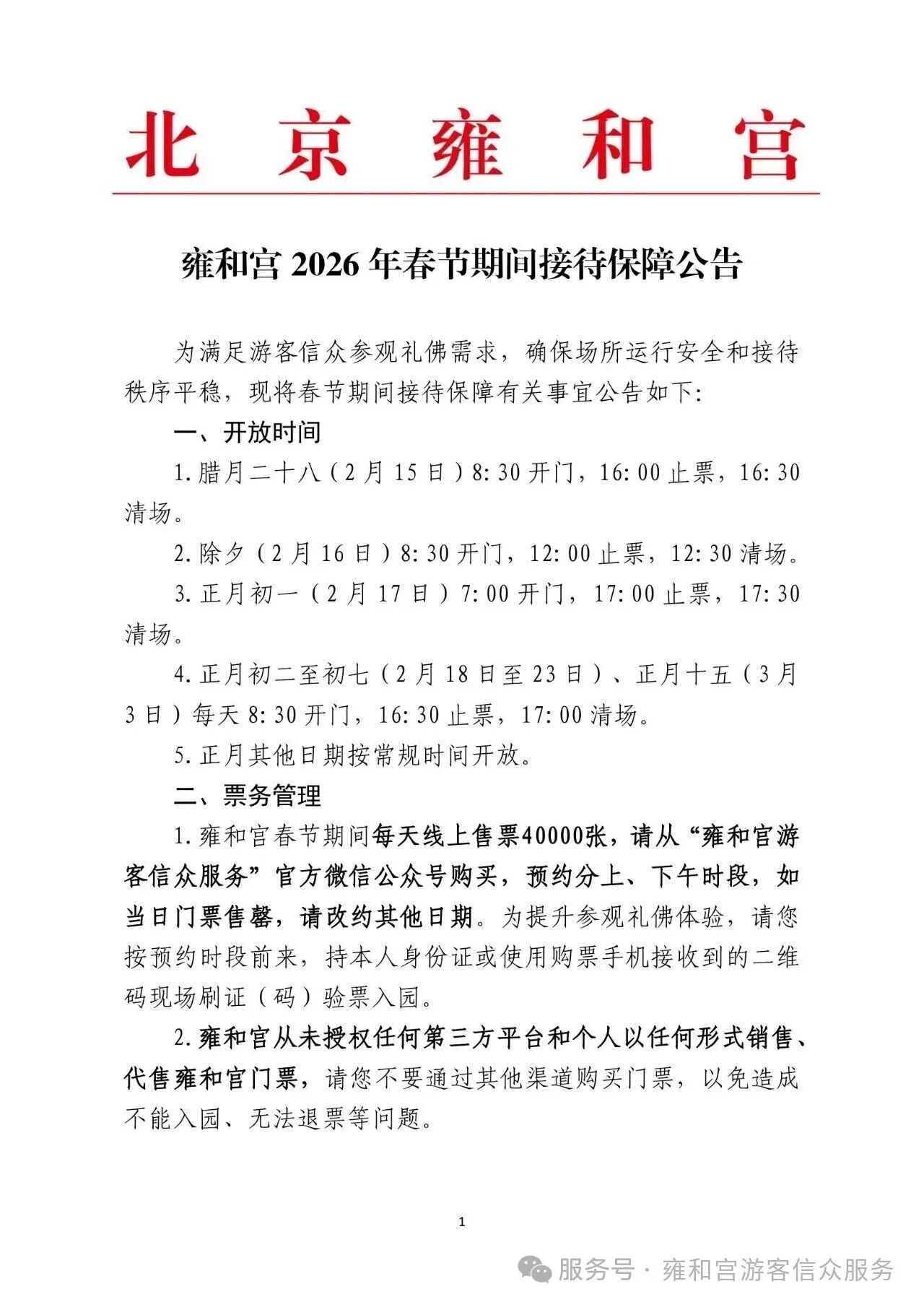 1、雍和宫春节期间每天线上售票40000张,请从“雍和宫游客信众服务”官方微信公众号购买,预约分上、下午时段,如当日门票售罄,请改约其他日期。为提升参观礼佛体验,请您按预约时段前来,持本人身份证或使用购票手机接收到的二维码现场刷证( 码)验票入园。