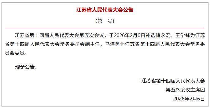 新京报讯 据江苏人大发布微信公众号消息,江苏省第十四届人民代表大会第五次会议,于2026年2月6日补选储永宏、王学锋为江苏省第十四届人民代表大会常务委员会副主任,马连美为江苏省第十四届人民代表大会常务委员会委员。