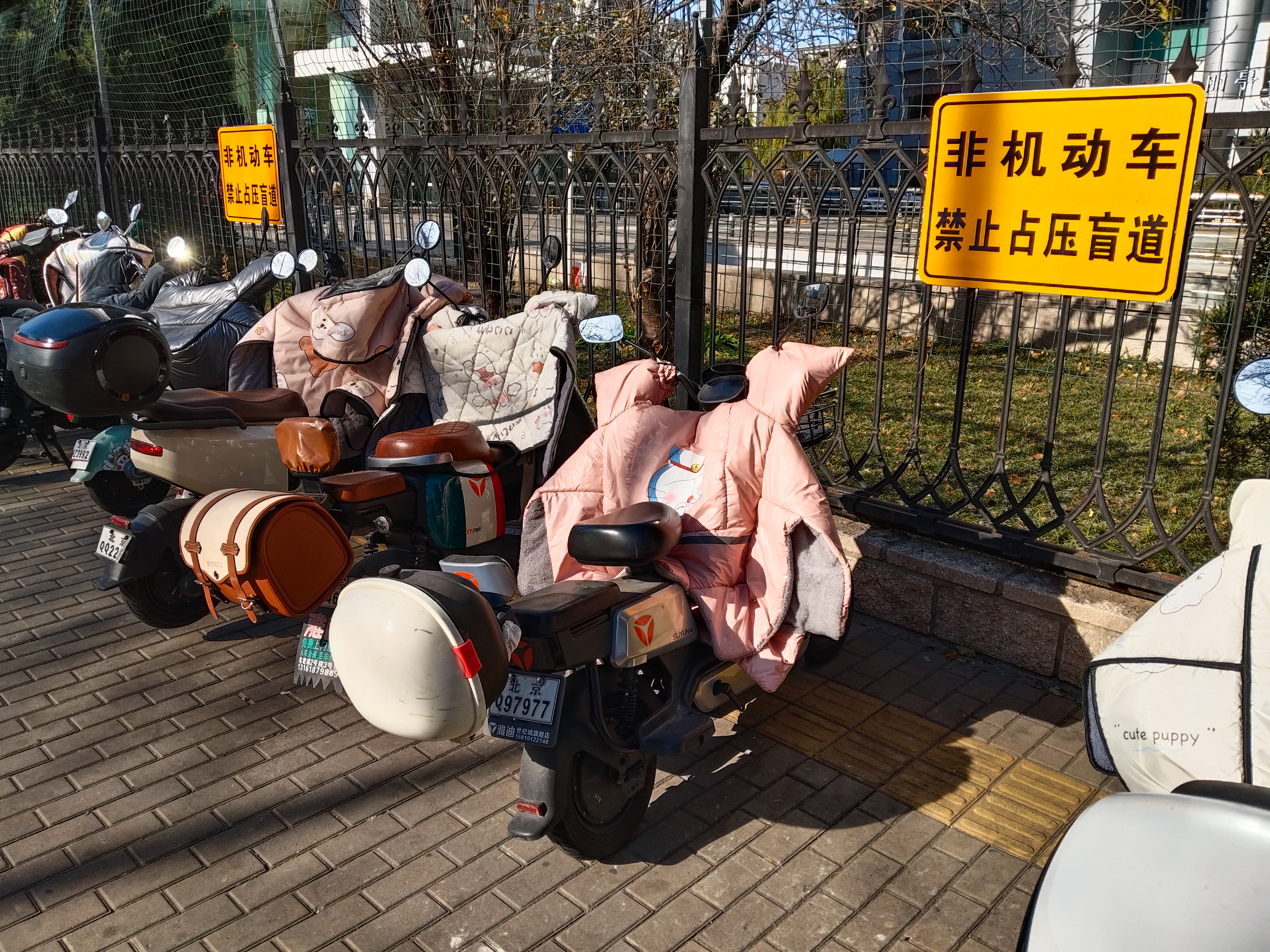 2025年11月24日,位于北京市海淀区知春路的一处盲道上停放着许多电动自行车。图/IC