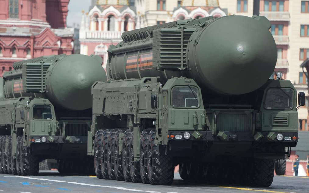 2025年5月9日,在莫斯科举行的纪念苏联伟大卫国战争胜利80周年阅兵式上的洲际弹道导弹。图/新华社