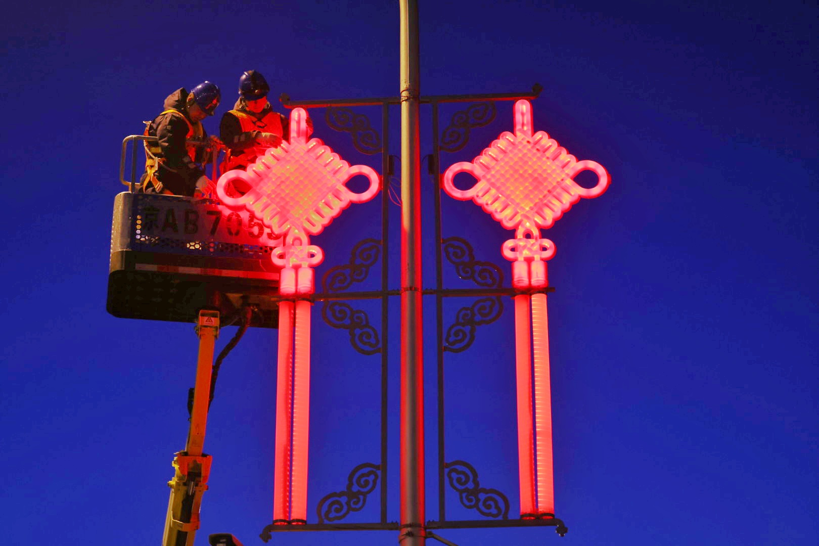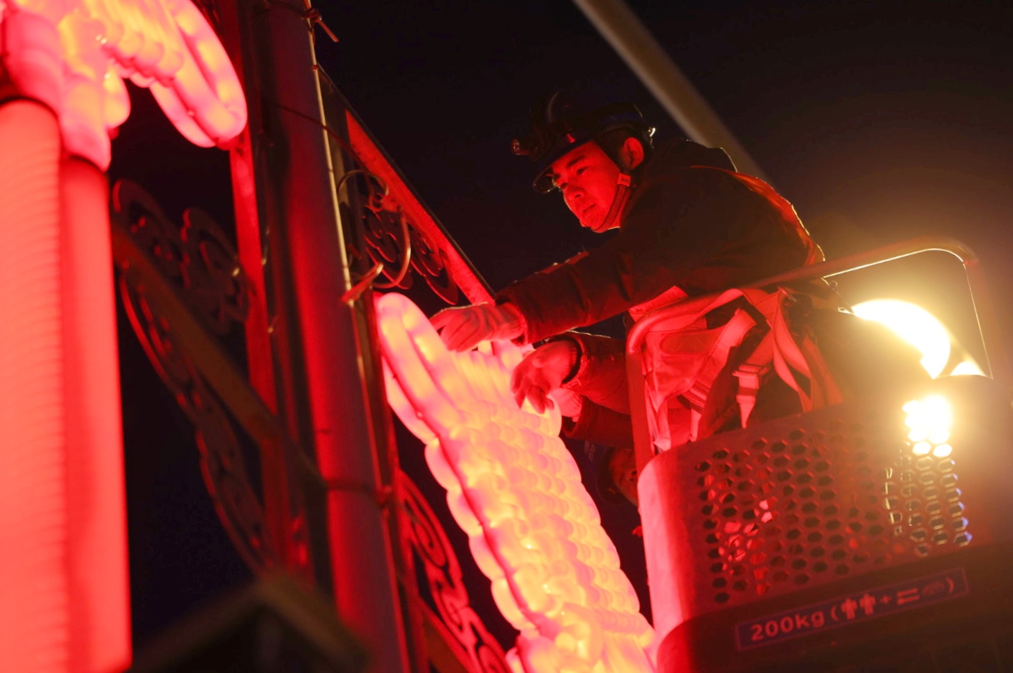 国网北京电力城市照明管理中心工作人员维护大红灯笼灯饰。新京报记者 李木易 摄