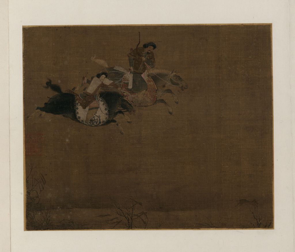 这幅宋代的《狩猎图》,狩猎者骑马逆风追逐,马作腾空状,猎物似为獐,正闻弦惊走。画面采取对角构图,张力拉满。男女装束如皮帽、貂袖(后世马褂的前身),以及弓具、马具如豹皮弓弢箭囊、缠枝花纹鞍鞯障泥等皆近辽金形制,并有等级象征。全图尺幅不大,但勾线细腻,赋色精致,风格、形象推测为宋人画北方民族的作品。