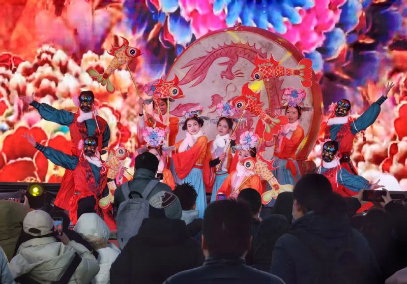 游客观看非遗表演。此次春节双会活动内容丰富多彩,集非遗表演、光影艺术、特色美食、趣味互动于一体。