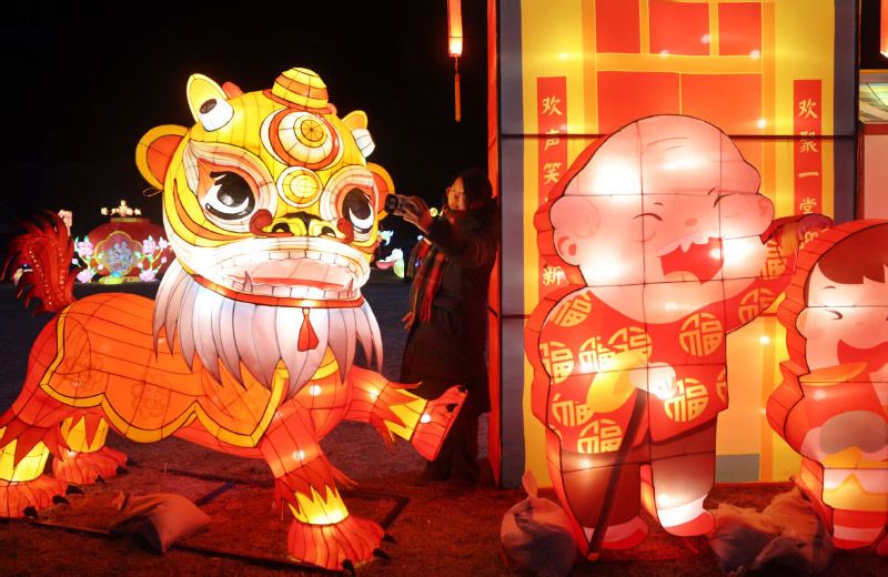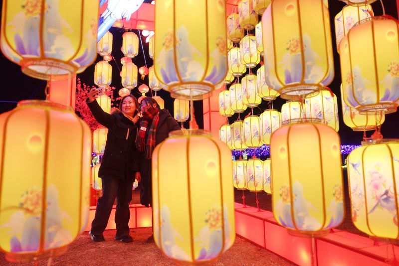 游客在花灯景观间拍照。园区打造了激光天幕、玫瑰花海、萤火虫草坪等打卡地,为游客打造全方位的新春体验。