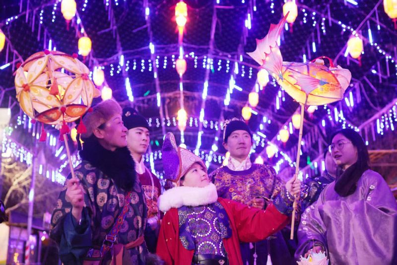 2月8日晚,“奥水英歌·奇幻光影”游园会在顺义奥林匹克水上公园亮相。非遗表演与3D裸眼灯光秀融合,呈现出“火树银花不夜天”的震撼景象。图为市民身穿汉服手持花灯游园。