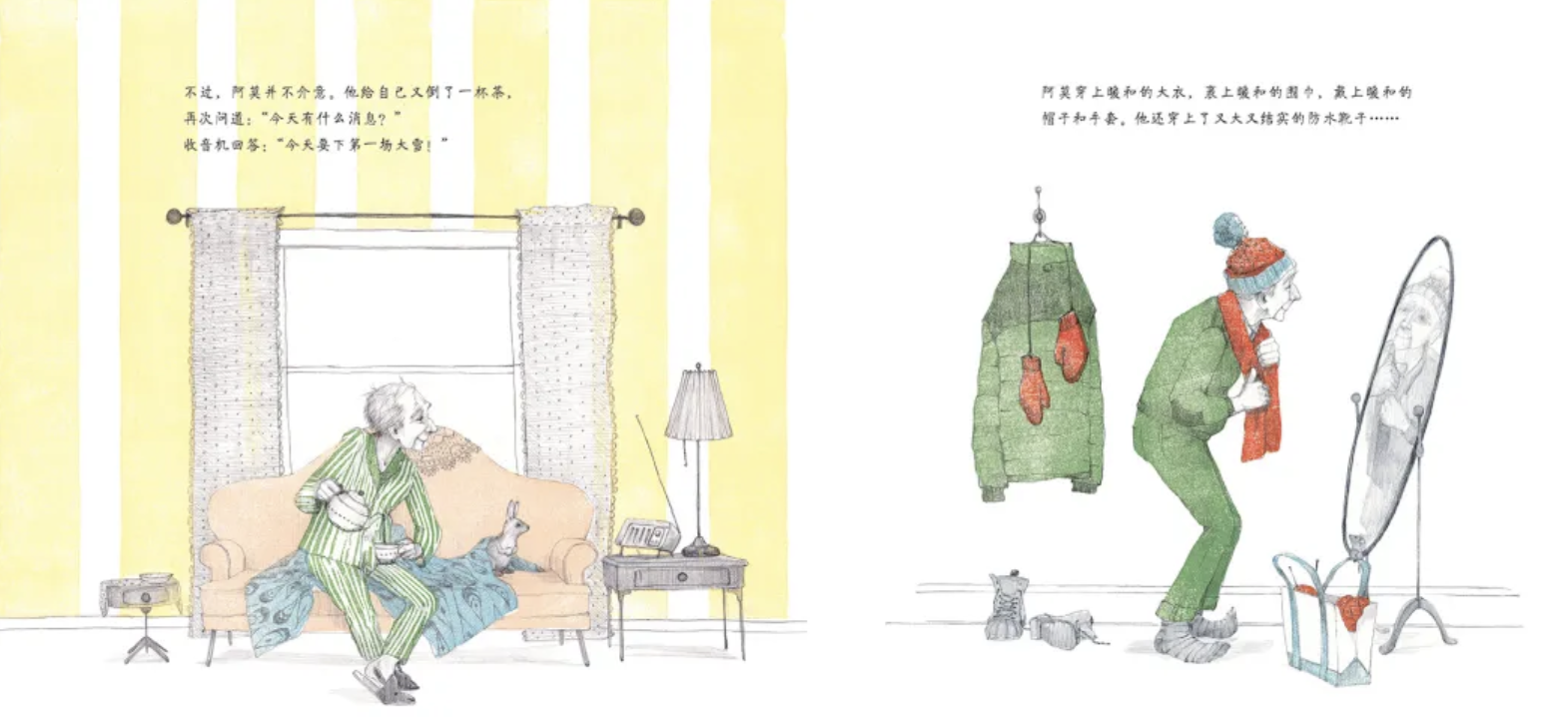 瞧瞧人家阿莫是怎么“等待”的——冬天临近了,他不像我们那样盯着手机屏幕刷天气预报,而是裹着那条熟悉的暖毯子,守着那台老式收音机。书里写道:“阿莫喜欢把收音机想象成一个噼啪作响的壁炉。每天,他都用收音机传来的各种可能的好消息来温暖自己。”