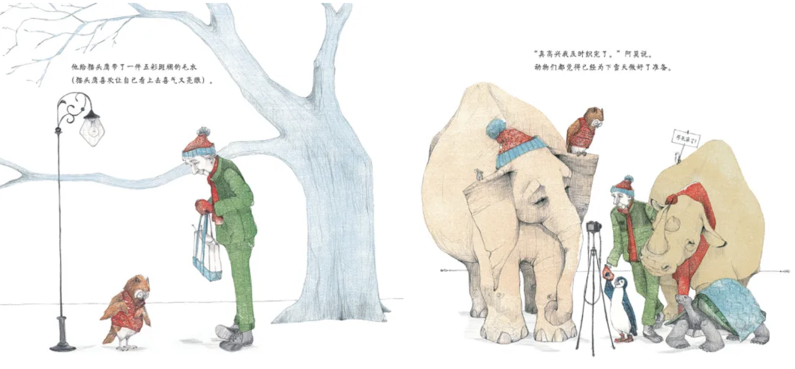 然而,当我翻开这本最新的《阿莫的下雪日》(A Snow Day for Amos McGee)时,一种奇妙的感动涌上心头,忍不住在微博里向书友们预告:“这是接续《阿莫的生病日》《阿莫的迟到日》的新篇,与第二本不同,第三本感觉更接近第一本的原味儿。”