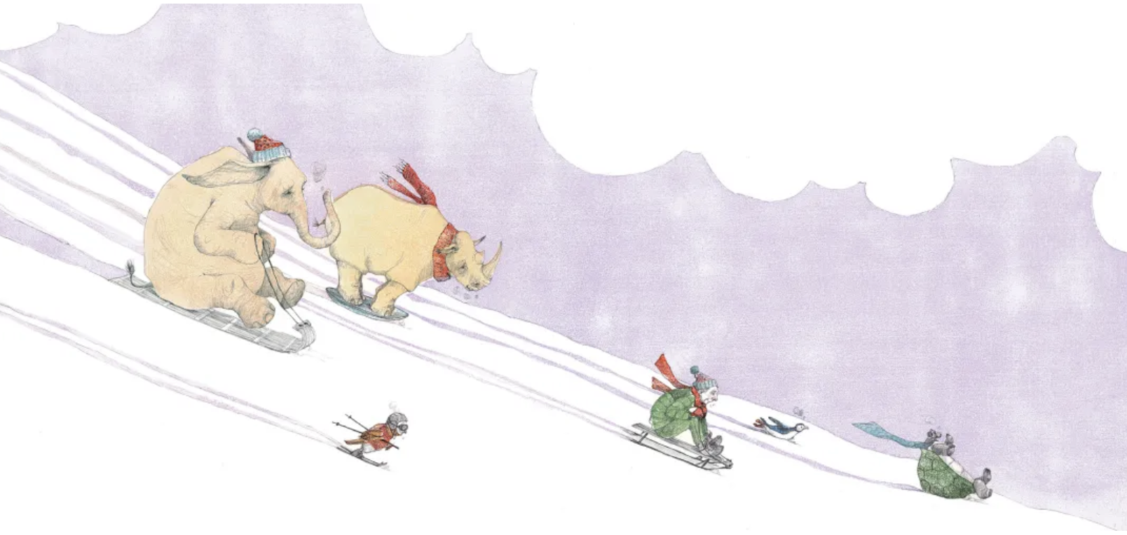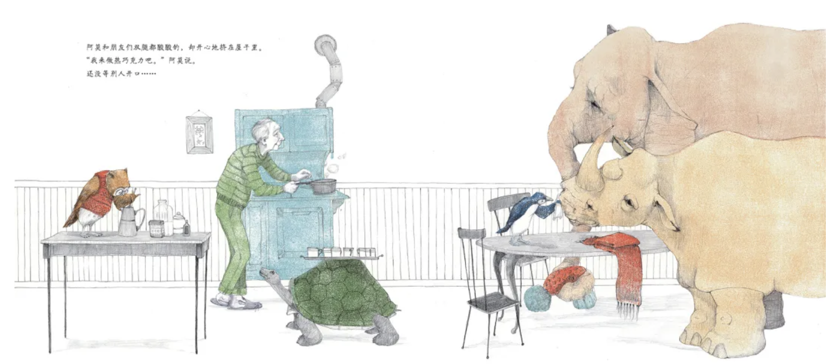 这就解释了为什么当雪没有如期而至,阿莫虽然有些失落但依然平和地回家时,动物们会再一次做出让我们心头一热的举动。在《阿莫的生病日》里,它们坐车去照顾生病的阿莫;在《阿莫的下雪日》里,它们离开了舒适的窝,一路铲着雪,来到阿莫的门前。不是因为它们需要阿莫,而是因为它们知道,阿莫也需要它们。