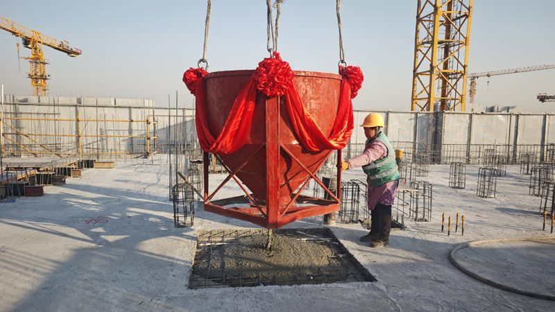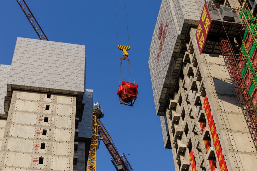工人指挥塔吊升起灰斗。据北京建工六建集团该项目负责人介绍,平房乡安置房(西区)项目属于朝阳区民生保障工程,共计22栋楼,总建筑面积26.23万平方米,主要建设内容包括安置房、公共服务配套设施、产业用房及地下车库。